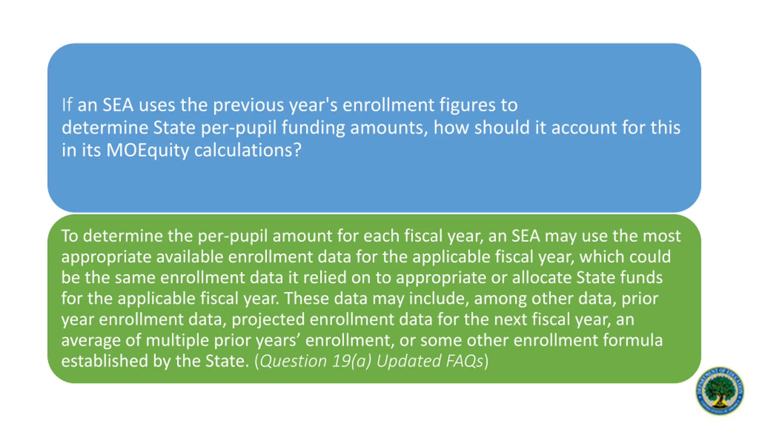 If an SEA uses the previous year's enrollment figures to determine State per-pupil funding amounts, how should it account for this in its MOEquity calculations? To determine the per-pupil amount for each fiscal year, an SEA may use the most appropriate available enrollment data for the applicable fiscal year, which could be the same enrollment data it relied on to appropriate or allocate State funds for the applicable fiscal year. These data may include, among other data, prior year enrollment data, projected enrollment data for the next fiscal year, an average of multiple prior years enrollment, or some other enrollment formula established by the State. (Question 19(a) Updated FAQs)
