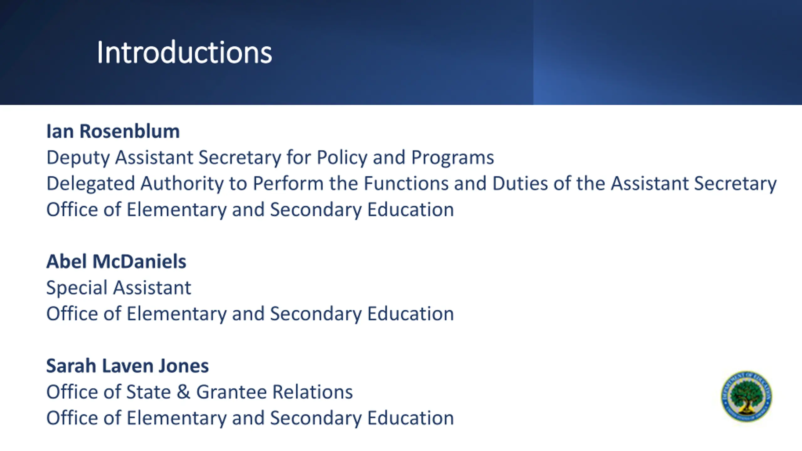 Introductions Introductions Ian Rosenblum Deputy Assistant Secretary for Policy and Programs Delegated Authority to Perform the Functions and Duties of the Assistant Secretary Office of Elementary and Secondary Education Abel McDaniels Special Assistant Office of Elementary and Secondary Education Sarah Laven Jones Office of State & Grantee Relations Office of Elementary and Secondary Education