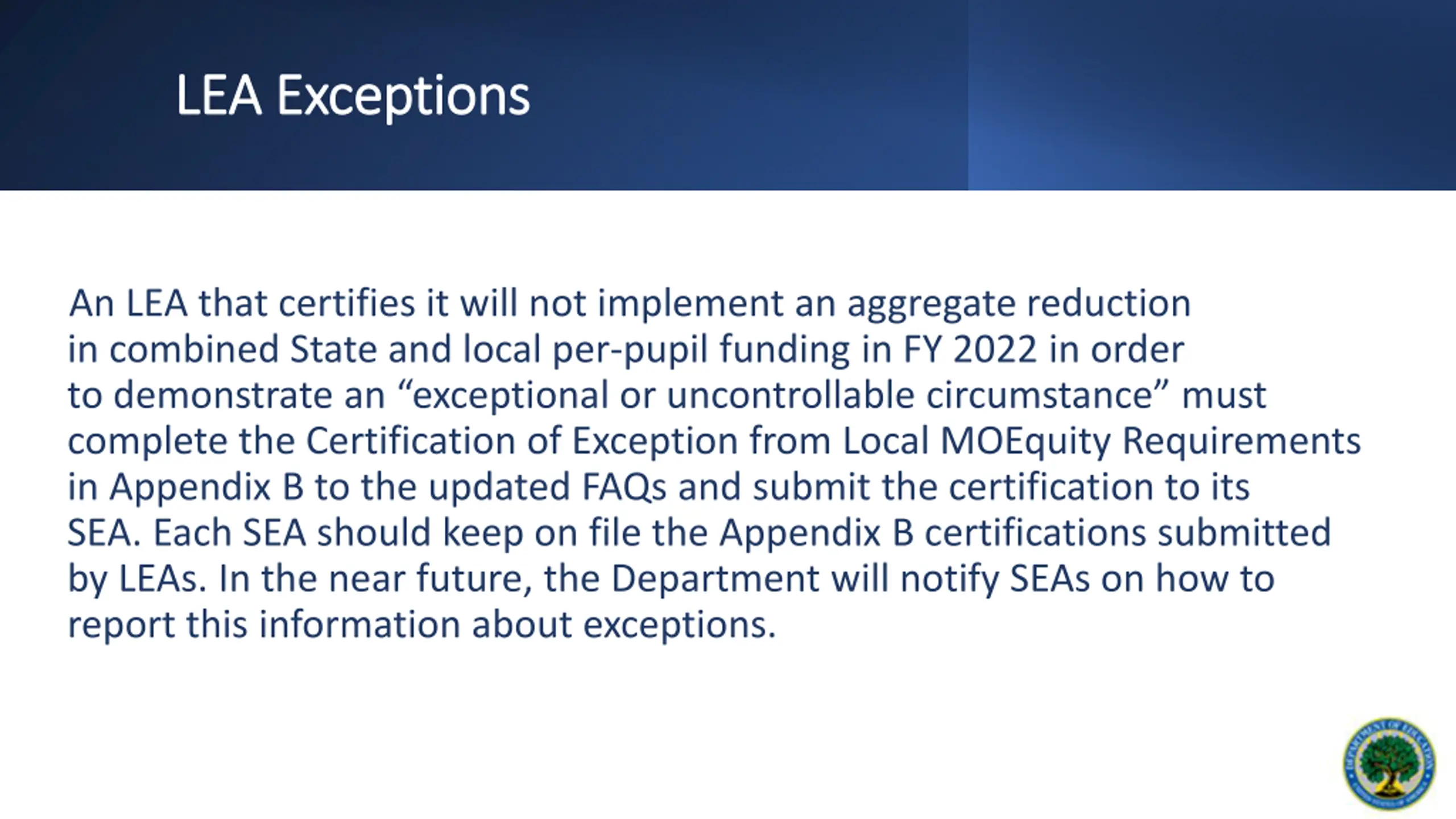LEA Exceptions LEA Exceptions An LEA that certifies it will not implement an aggregate reduction in combined State and local per-pupil funding in FY 2022 in order to demonstrate an exceptional or uncontrollable circumstance must complete the Certification of Exception from Local MOEquity Requirements in Appendix B to the updated FAQs and submit the certification to its SEA. Each SEA should keep on file the Appendix B certifications submitted by LEAs. In the near future, the Department will notify SEAs on how to report this information about exceptions.