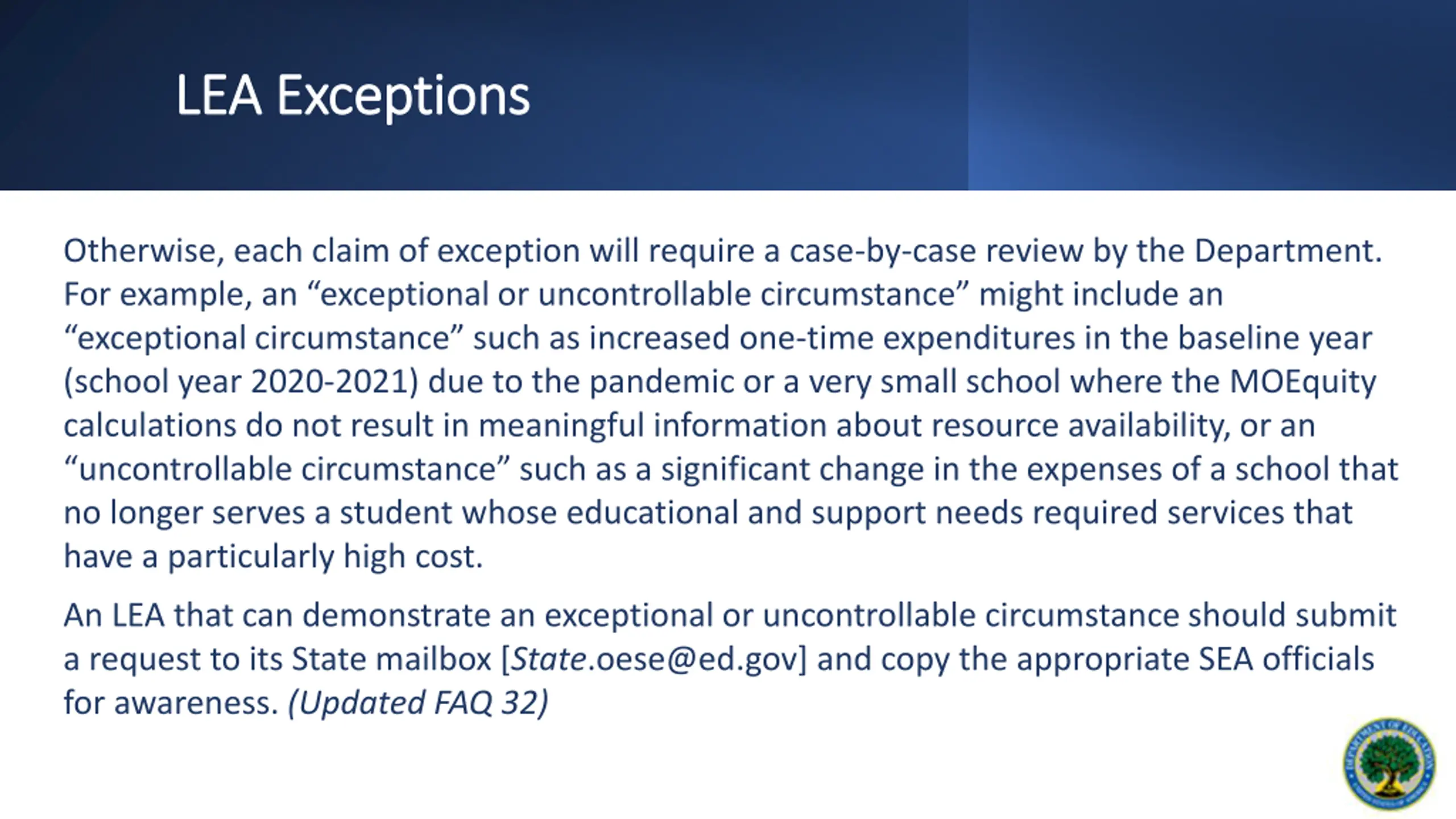 LEA Exceptions LEA Exceptions Otherwise, each claim of exception will require a case-by-case review by the Department. For example, an exceptional or uncontrollable circumstance might include an exceptional circumstance such as increased one-time expenditures in the baseline year (school year 2020-2021) due to the pandemic or a very small school where the MOEquity calculations do not result in meaningful information about resource availability, or an uncontrollable circumstance such as a significant change in the expenses of a school that no longer serves a student whose educational and support needs required services that have a particularly high cost. An LEA that can demonstrate an exceptional or uncontrollable circumstance should submit a request to its State mailbox [State.oese@ed.gov] and copy the appropriate SEA officials for awareness. (Updated FAQ 32)