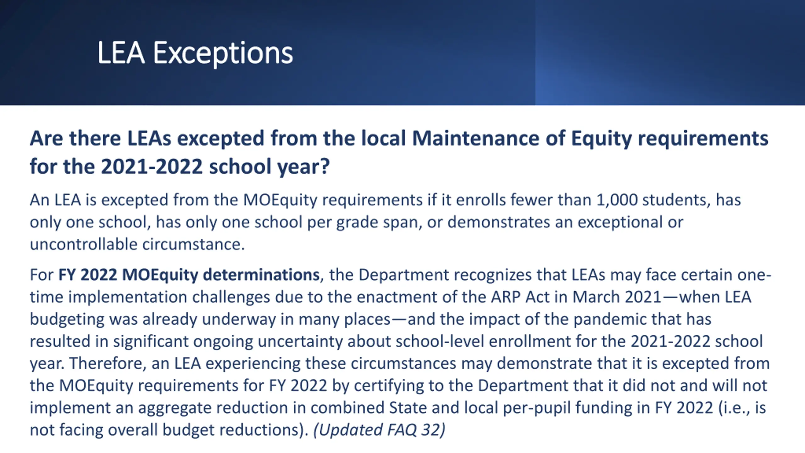 LEA Exceptions LEA Exceptions Are there LEAs excepted from the local Maintenance of Equity requirements for the 2021-2022 school year? An LEA is excepted from the MOEquity requirements if it enrolls fewer than 1,000 students, has only one school, has only one school per grade span, or demonstrates an exceptional or uncontrollable circumstance. For FY 2022 MOEquity determinations, the Department recognizes that LEAs may face certain one- time implementation challenges due to the enactment of the ARP Act in March 2021 when LEA budgeting was already underway in many places and the impact of the pandemic that has resulted in significant ongoing uncertainty about school-level enrollment for the 2021-2022 school year. Therefore, an LEA experiencing these circumstances may demonstrate that it is excepted from the MOEquity requirements for FY 2022 by certifying to the Department that it did not and will not implement an aggregate reduction in combined State and local per-pupil funding in FY 2022 (i.e., is not facing overall budget reductions). (Updated FAQ 32)