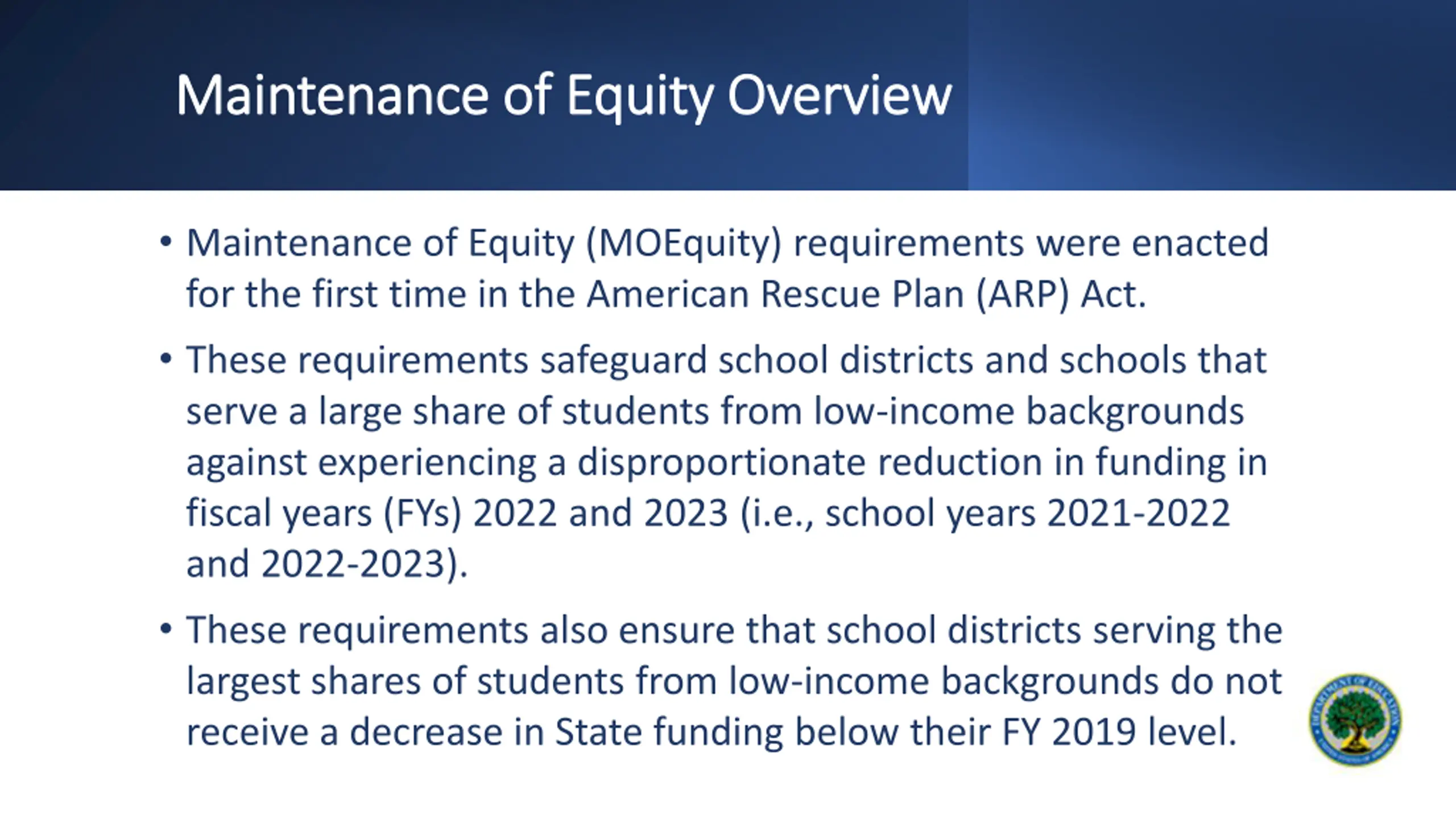 Maintenance of Equity Overview Maintenance of Equity Overview Maintenance of Equity (MOEquity) requirements were enacted for the first time in the American Rescue Plan (ARP) Act. These requirements safeguard school districts and schools that serve a large share of students from low-income backgrounds against experiencing a disproportionate reduction in funding in fiscal years (FYs) 2022 and 2023 (i.e., school years 2021-2022 and 2022-2023). These requirements also ensure that school districts serving the largest shares of students from low-income backgrounds do not receive a decrease in State funding below their FY 2019 level.
