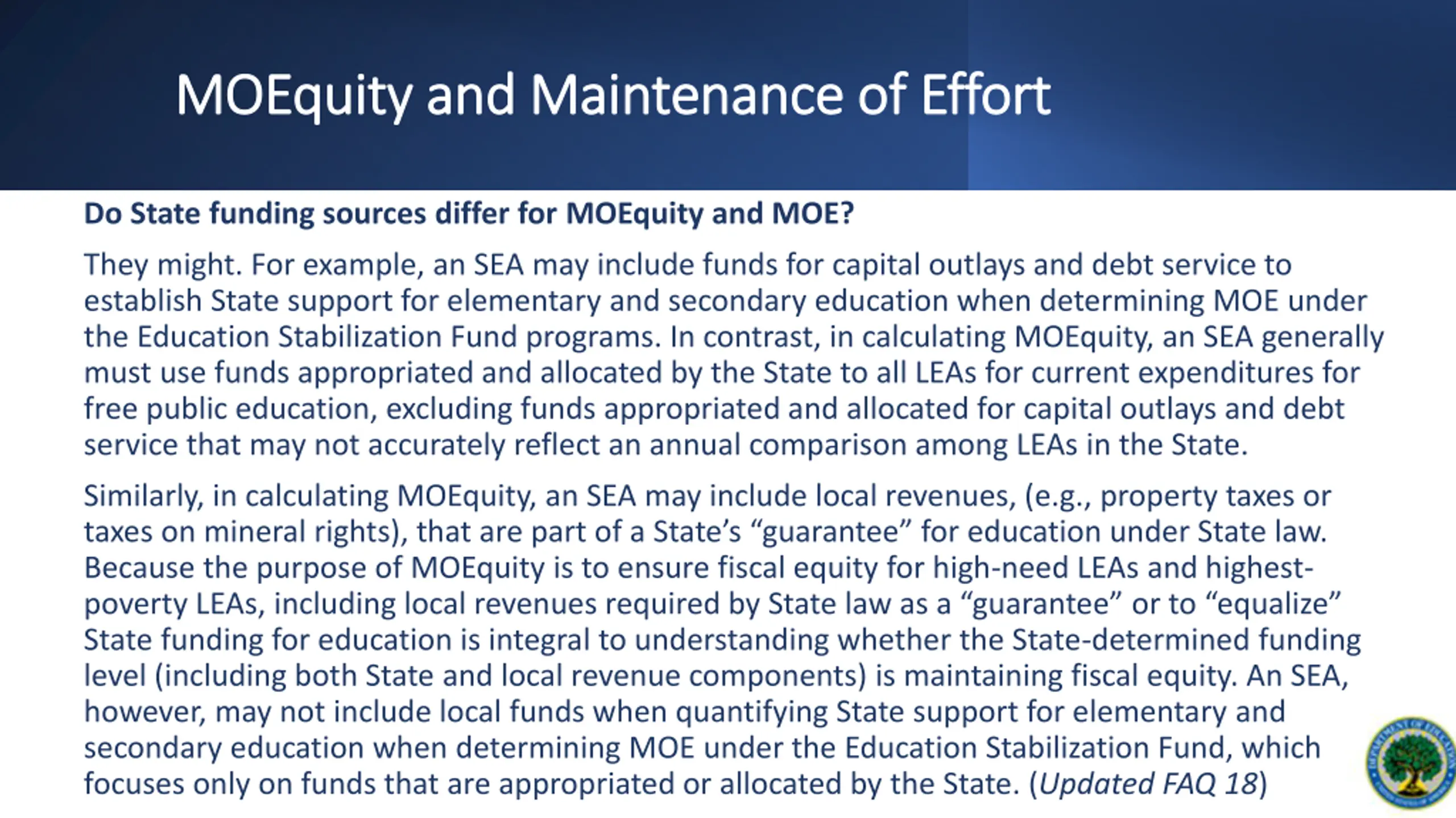 MOEquity MOEquity and Maintenance of Effort and Maintenance of Effort Do State funding sources differ for MOEquity and MOE? They might. For example, an SEA may include funds for capital outlays and debt service to establish State support for elementary and secondary education when determining MOE under the Education Stabilization Fund programs. In contrast, in calculating MOEquity, an SEA generally must use funds appropriated and allocated by the State to all LEAs for current expenditures for free public education, excluding funds appropriated and allocated for capital outlays and debt service that may not accurately reflect an annual comparison among LEAs in the State. Similarly, in calculating MOEquity, an SEA may include local revenues, (e.g., property taxes or taxes on mineral rights), that are part of a State s guarantee for education under State law. Because the purpose of MOEquity is to ensure fiscal equity for high-need LEAs and highest- poverty LEAs, including local revenues required by State law as a guarantee or to equalize State funding for education is integral to understanding whether the State-determined funding level (including both State and local revenue components) is maintaining fiscal equity. An SEA, however, may not include local funds when quantifying State support for elementary and secondary education when determining MOE under the Education Stabilization Fund, which focuses only on funds that are appropriated or allocated by the State. (Updated FAQ 18)