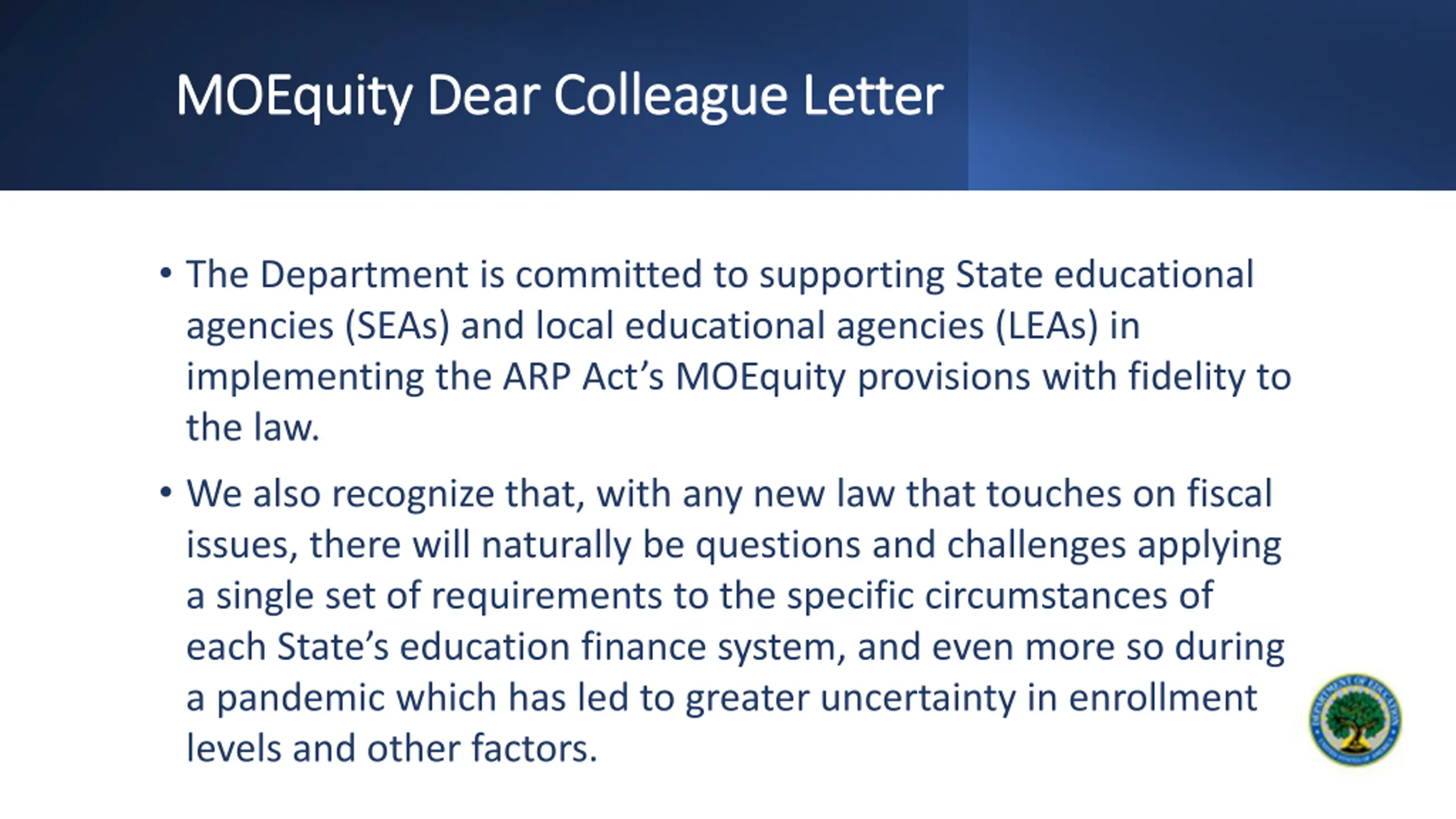 MOEquity MOEquity Dear Colleague Dear Colleague Letter Letter The Department is committed to supporting State educational agencies (SEAs) and local educational agencies (LEAs) in implementing the ARP Act s MOEquity provisions with fidelity to the law. We also recognize that, with any new law that touches on fiscal issues, there will naturally be questions and challenges applying a single set of requirements to the specific circumstances of each State s education finance system, and even more so during a pandemic which has led to greater uncertainty in enrollment levels and other factors.