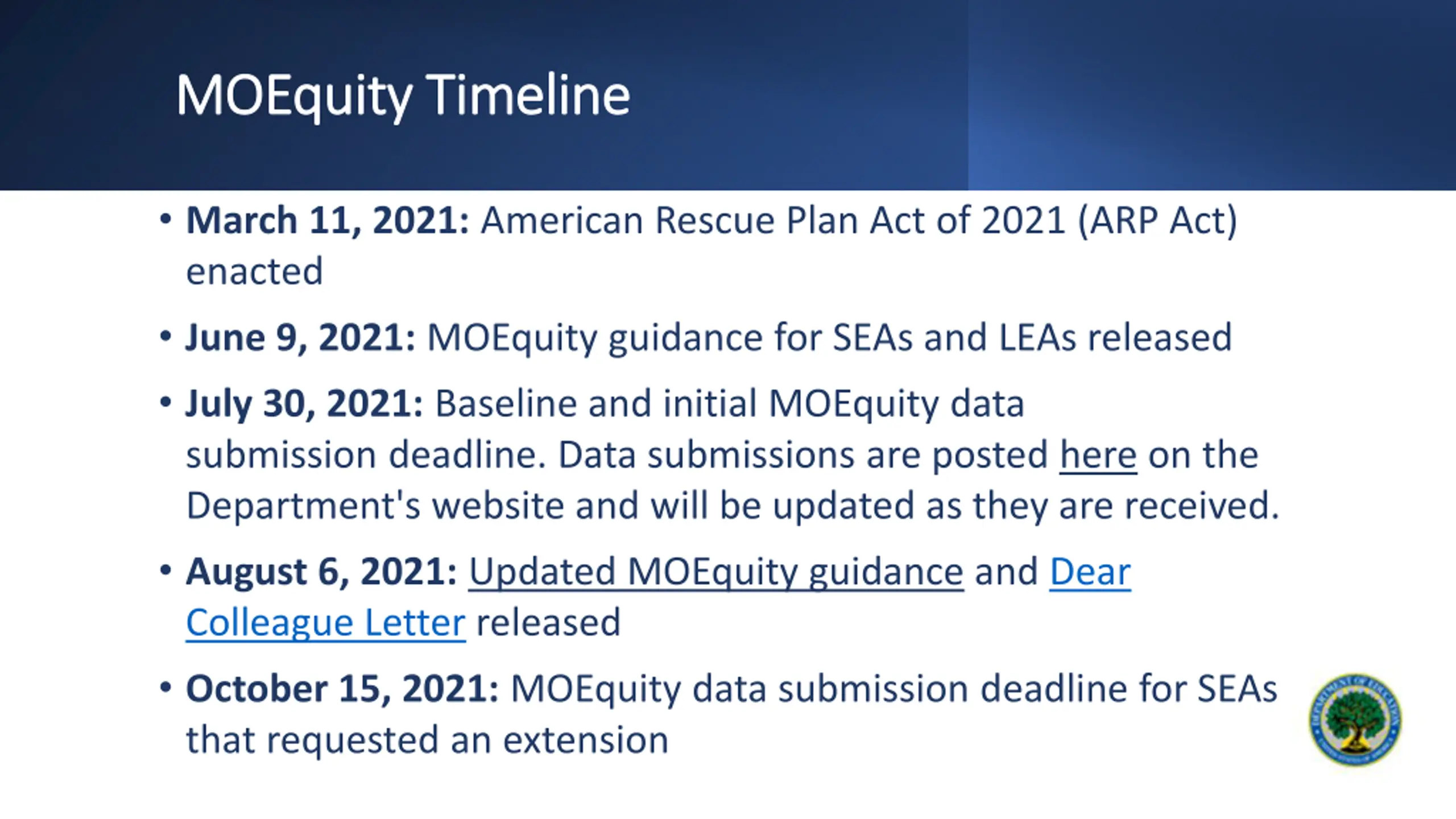MOEquity MOEquity Timeline Timeline March 11, 2021: American Rescue Plan Act of 2021 (ARP Act) enacted June 9, 2021: MOEquity guidance for SEAs and LEAs released July 30, 2021: Baseline and initial MOEquity data submission deadline. Data submissions are posted here on the Department's website and will be updated as they are received. August 6, 2021: Updated MOEquity guidance and Dear Colleague Letter released October 15, 2021: MOEquity data submission deadline for SEAs that requested an extension