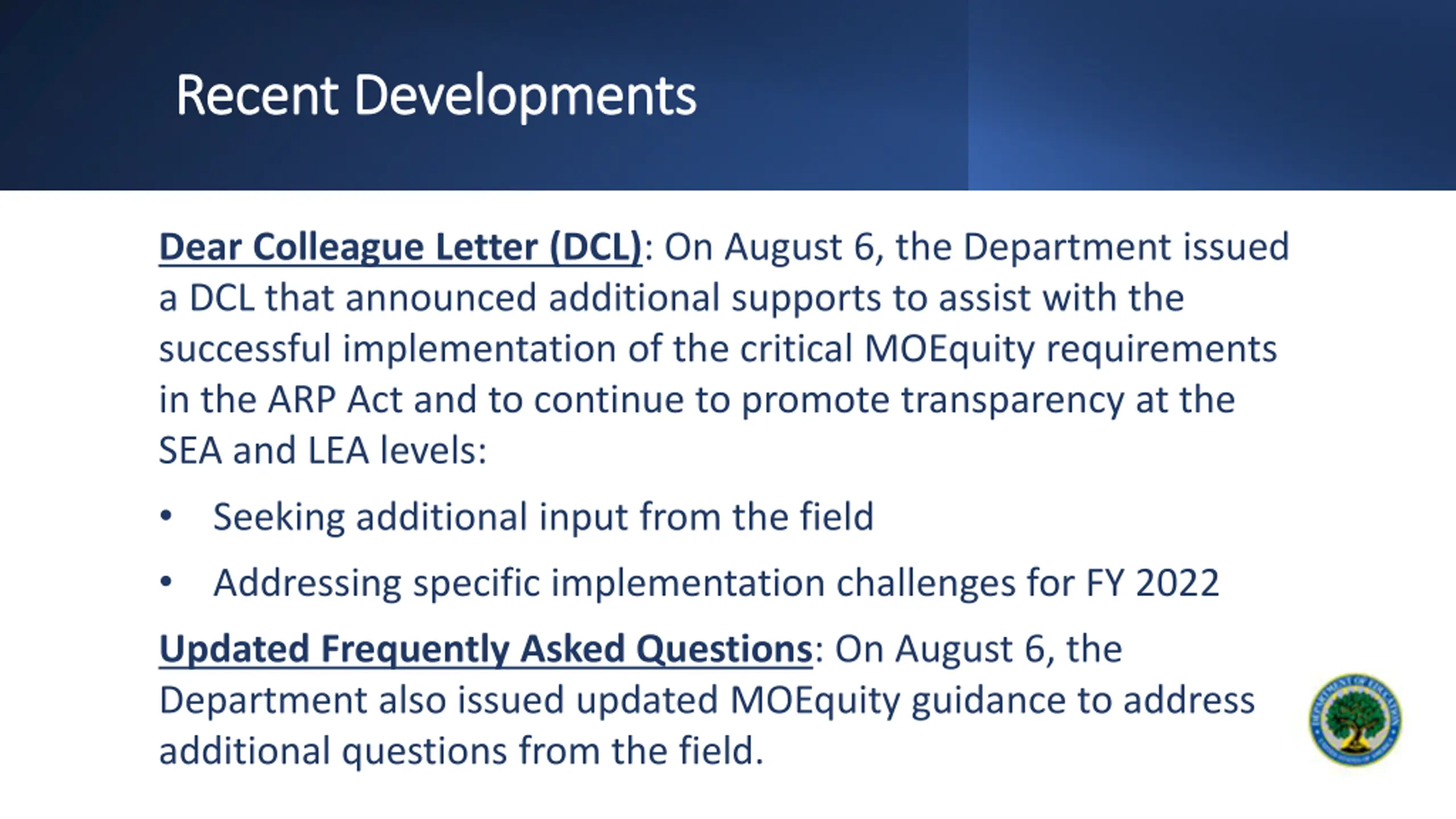 Recent Developments Recent Developments Dear Colleague Letter (DCL): On August 6, the Department issued a DCL that announced additional supports to assist with the successful implementation of the critical MOEquity requirements in the ARP Act and to continue to promote transparency at the SEA and LEA levels: Seeking additional input from the field Addressing specific implementation challenges for FY 2022 Updated Frequently Asked Questions: On August 6, the Department also issued updated MOEquity guidance to address additional questions from the field.