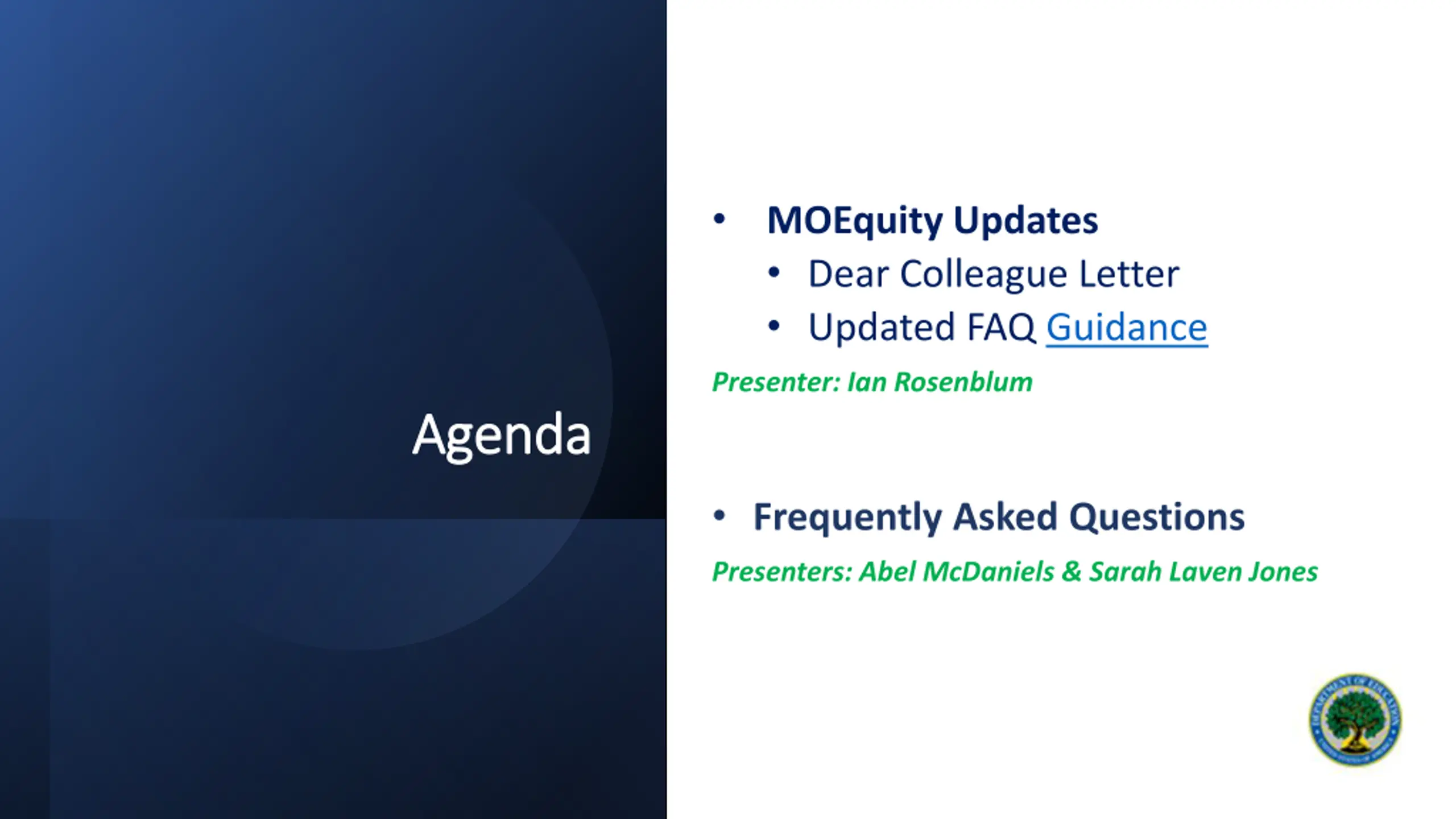 MOEquity Updates Dear Colleague Letter Updated FAQ Guidance Presenter: Ian Rosenblum Agenda Agenda Frequently Asked Questions Presenters: Abel McDaniels & Sarah Laven Jones
