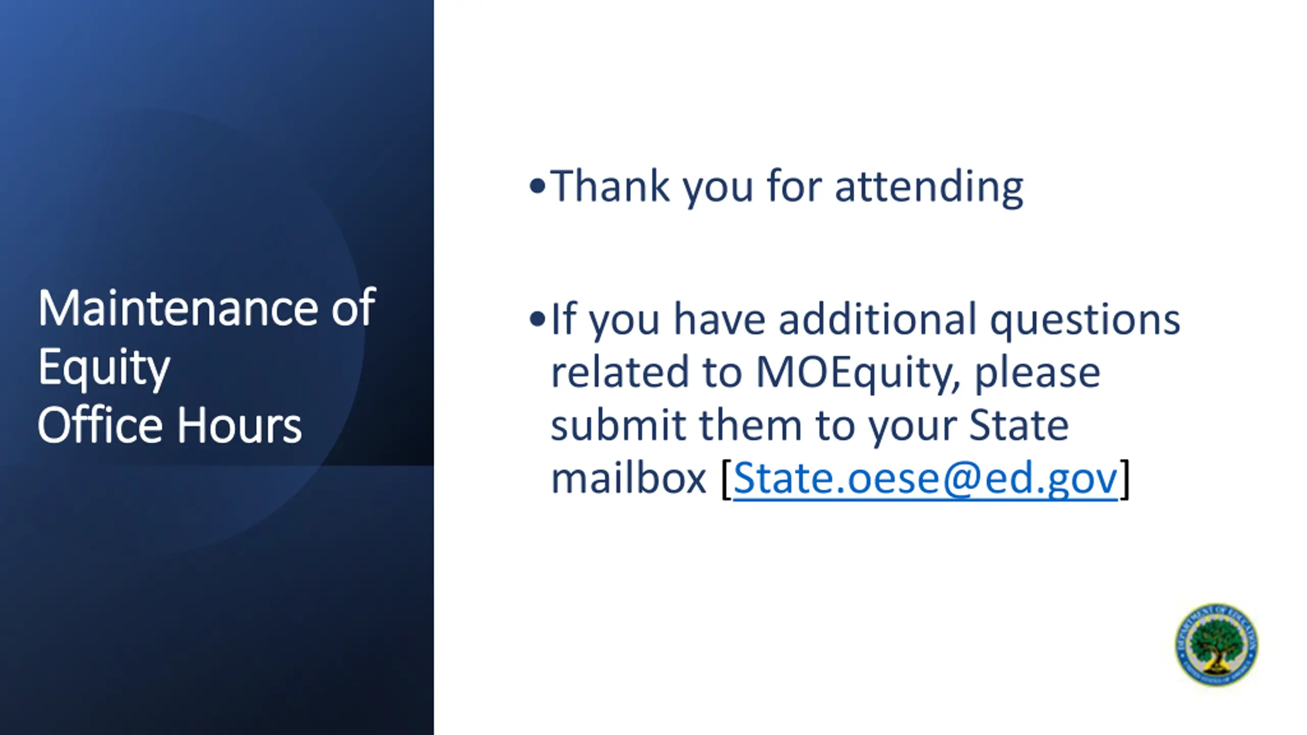 Thank you for attending Maintenance of Maintenance of Equity Equity Office Hours Office Hours If you have additional questions related to MOEquity, please submit them to your State mailbox [State.oese@ed.gov]