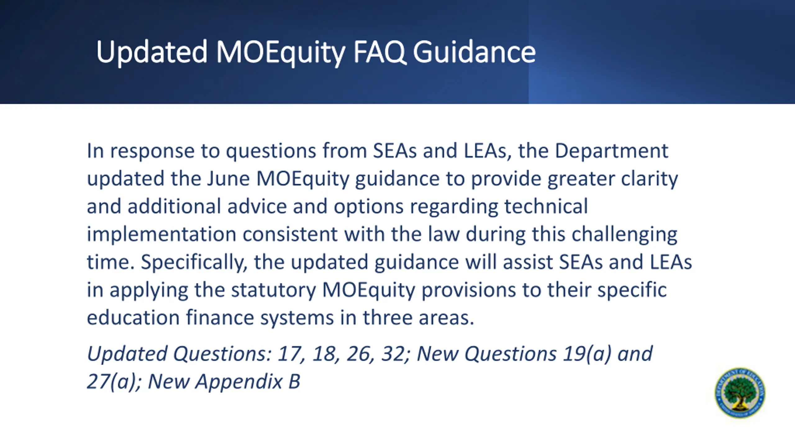 Updated Updated MOEquity MOEquity FAQ Guidance FAQ Guidance In response to questions from SEAs and LEAs, the Department updated the June MOEquity guidance to provide greater clarity and additional advice and options regarding technical implementation consistent with the law during this challenging time. Specifically, the updated guidance will assist SEAs and LEAs in applying the statutory MOEquity provisions to their specific education finance systems in three areas. Updated Questions: 17, 18, 26, 32; New Questions 19(a) and 27(a); New Appendix B