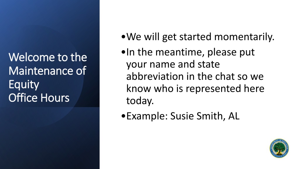 We will get started momentarily. In the meantime, please put your name and state abbreviation in the chat so we know who is represented here today. Example: Susie Smith, AL Welcome to the Welcome to the Maintenance of Maintenance of Equity Equity Office Hours Office Hours