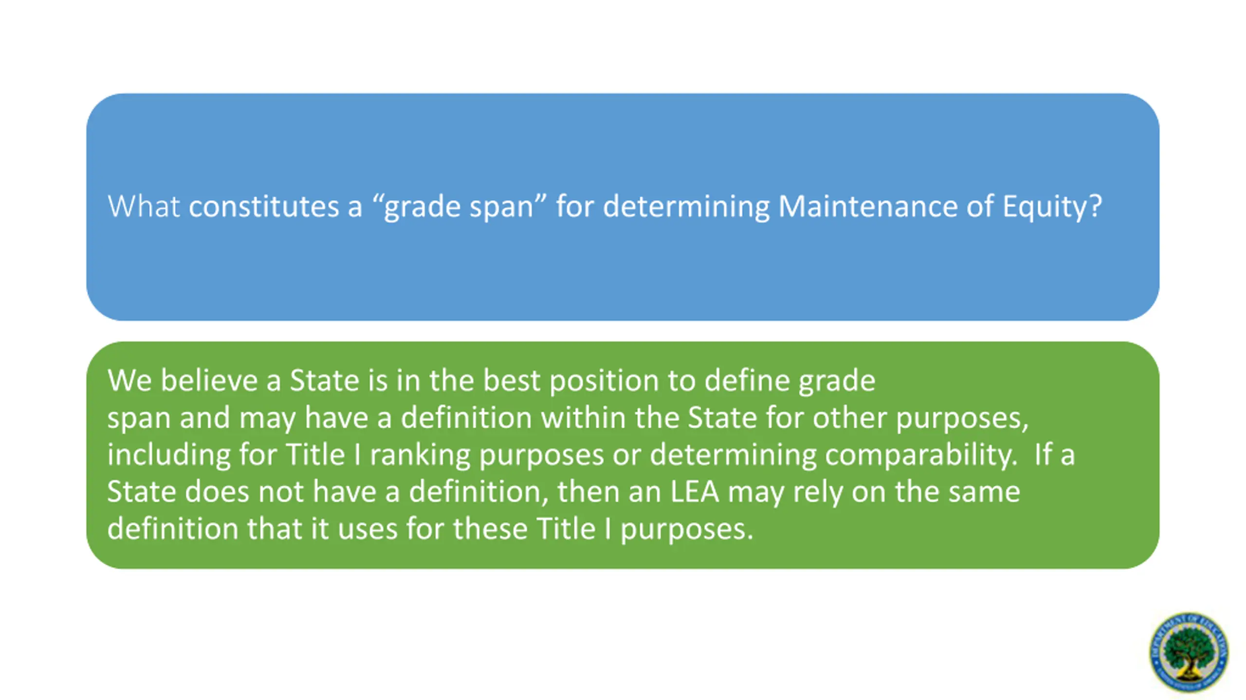 What constitutes a grade span for determining Maintenance of Equity? We believe a State is in the best position to define grade span and may have a definition within the State for other purposes, including for Title I ranking purposes or determining comparability. If a State does not have a definition, then an LEA may rely on the same definition that it uses for these Title I purposes.
