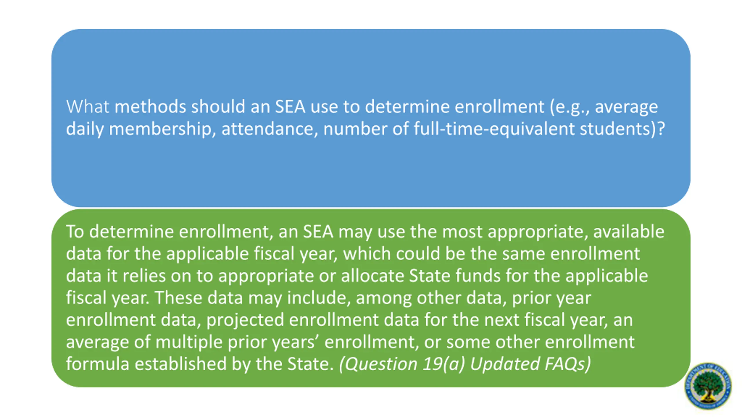 What methods should an SEA use to determine enrollment (e.g., average daily membership, attendance, number of full-time-equivalent students)? To determine enrollment, an SEA may use the most appropriate, available data for the applicable fiscal year, which could be the same enrollment data it relies on to appropriate or allocate State funds for the applicable fiscal year. These data may include, among other data, prior year enrollment data, projected enrollment data for the next fiscal year, an average of multiple prior years enrollment, or some other enrollment formula established by the State. (Question 19(a) Updated FAQs)