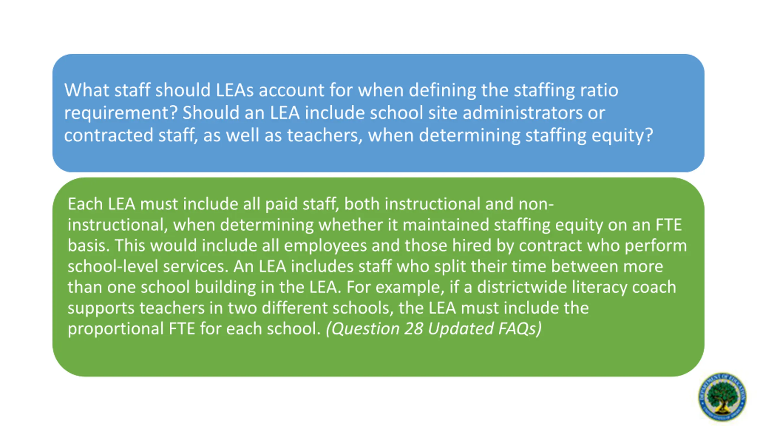 What staff should LEAs account for when defining the staffing ratio requirement? Should an LEA include school site administrators or contracted staff, as well as teachers, when determining staffing equity? Each LEA must include all paid staff, both instructional and non- instructional, when determining whether it maintained staffing equity on an FTE basis. This would include all employees and those hired by contract who perform school-level services. An LEA includes staff who split their time between more than one school building in the LEA. For example, if a districtwide literacy coach supports teachers in two different schools, the LEA must include the proportional FTE for each school. (Question 28 Updated FAQs)