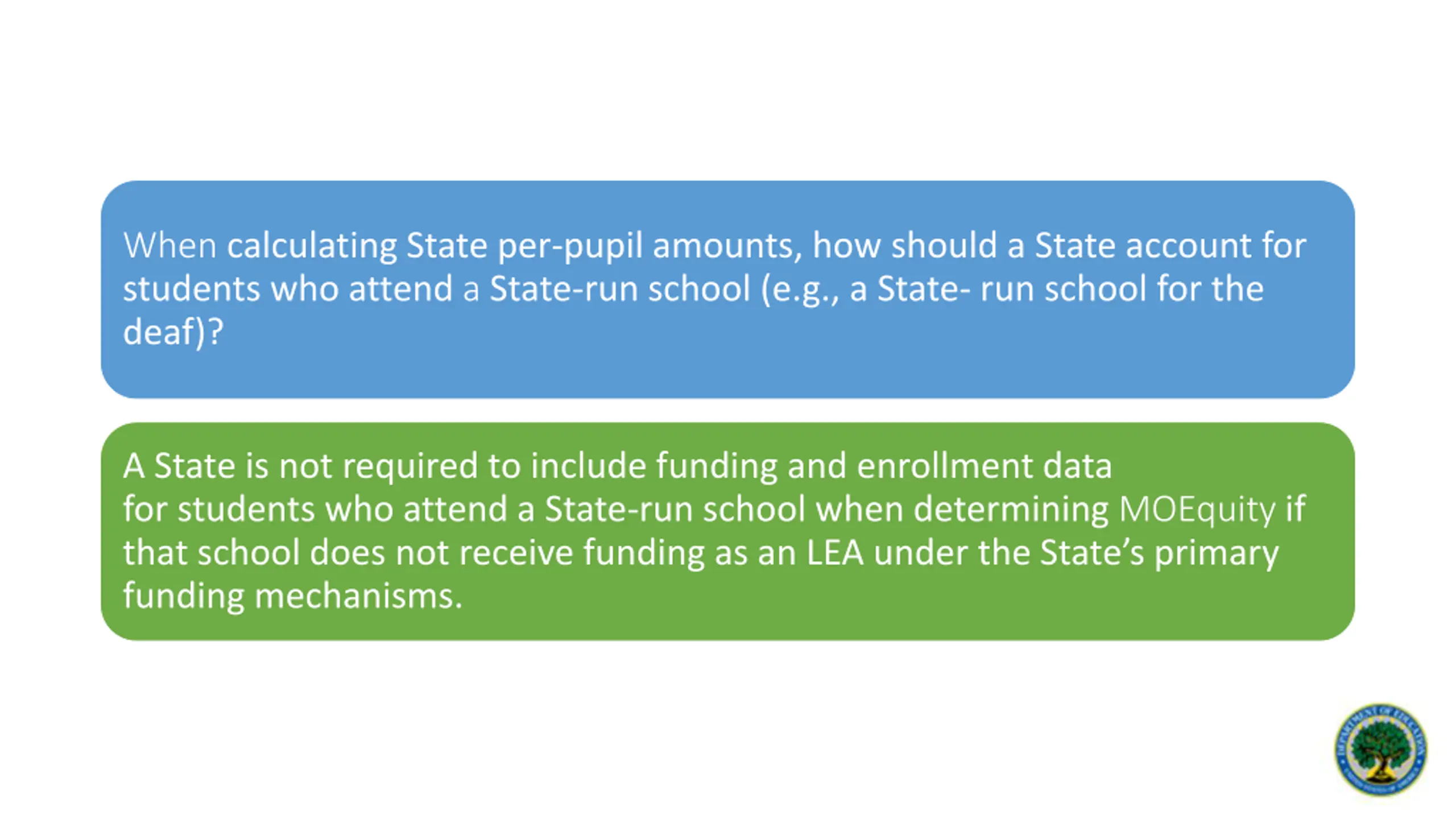 When calculating State per-pupil amounts, how should a State account for students who attend a State-run school (e.g., a State- run school for the deaf)? A State is not required to include funding and enrollment data for students who attend a State-run school when determining MOEquity if that school does not receive funding as an LEA under the State s primary funding mechanisms.