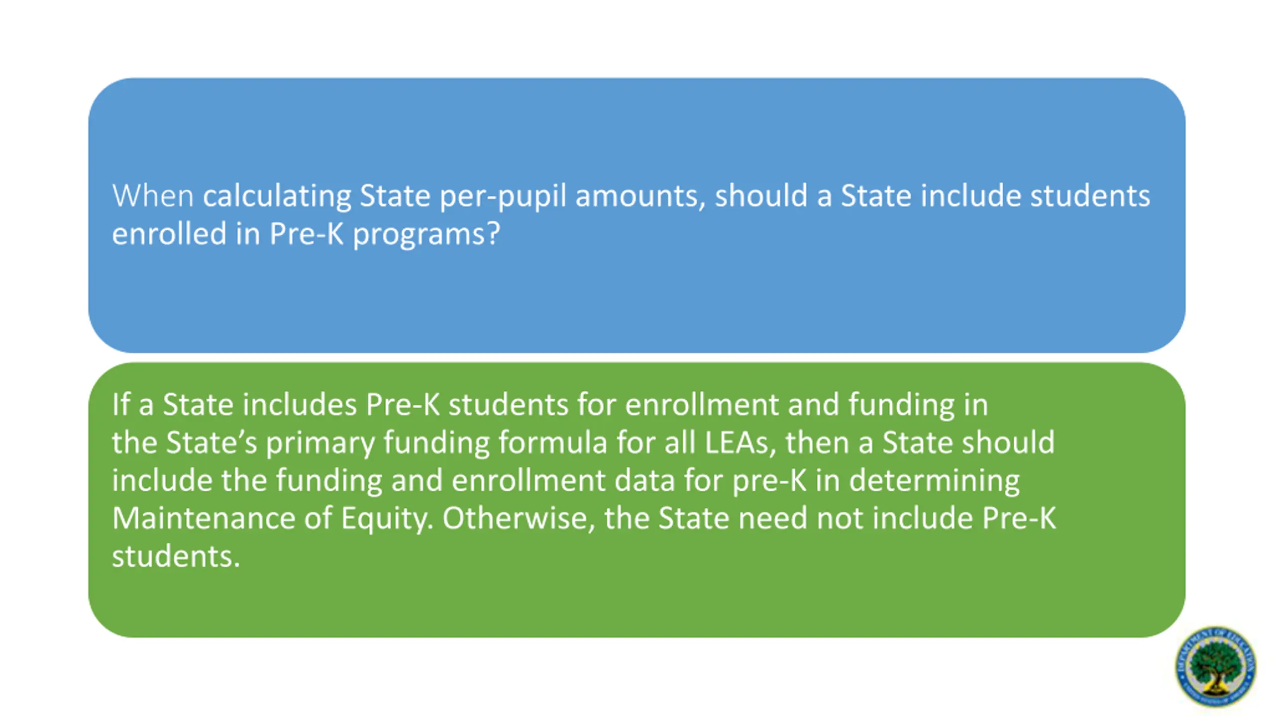 When calculating State per-pupil amounts, should a State include students enrolled in Pre-K programs? If a State includes Pre-K students for enrollment and funding in the State s primary funding formula for all LEAs, then a State should include the funding and enrollment data for pre-K in determining Maintenance of Equity. Otherwise, the State need not include Pre-K students.