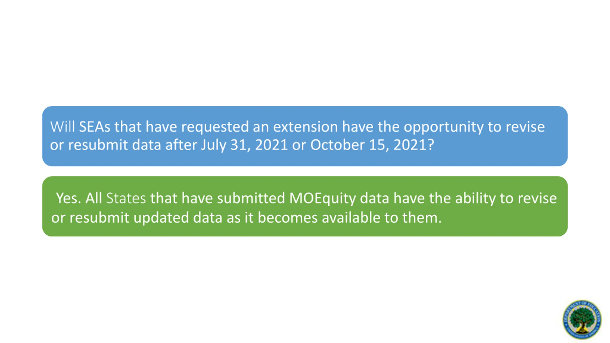 Will SEAs that have requested an extension have the opportunity to revise or resubmit data after July 31, 2021 or October 15, 2021? Yes. All States that have submitted MOEquity data have the ability to revise or resubmit updated data as it becomes available to them.
