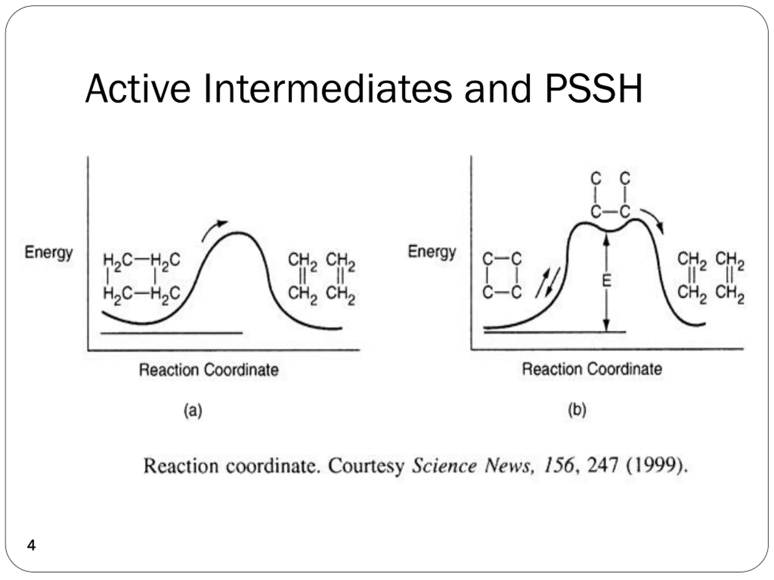 Active Intermediates and PSSH An active intermediate is a molecule that is in a highly energetic and reactive state It is short lived as it disappears virtually as fast as it is formed. That is, the net rate of reaction of an active intermediate, A*, is zero. The assumption that the net rate of reaction is zero is called the Pseudo Steady State Hypothesis (PSSH) 3