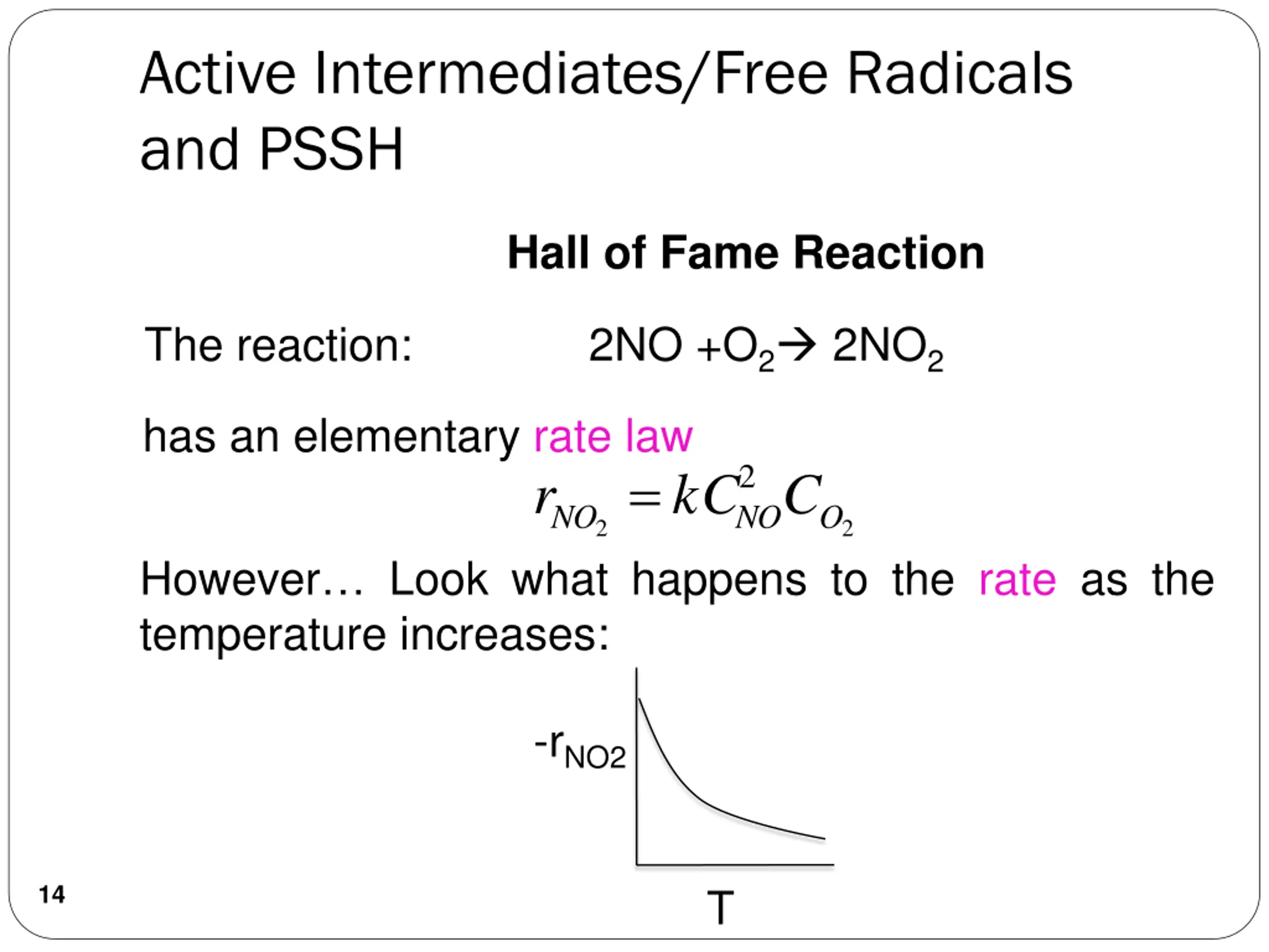 Active Intermediates/Free Radicals and PSSH Hall of Fame Reaction The reaction: 2NO +O2 2NO2 has an elementary rate law = 2 NO NO r kC C O 2 2 However Look what happens to the rate as the temperature increases: -rNO2 14 T