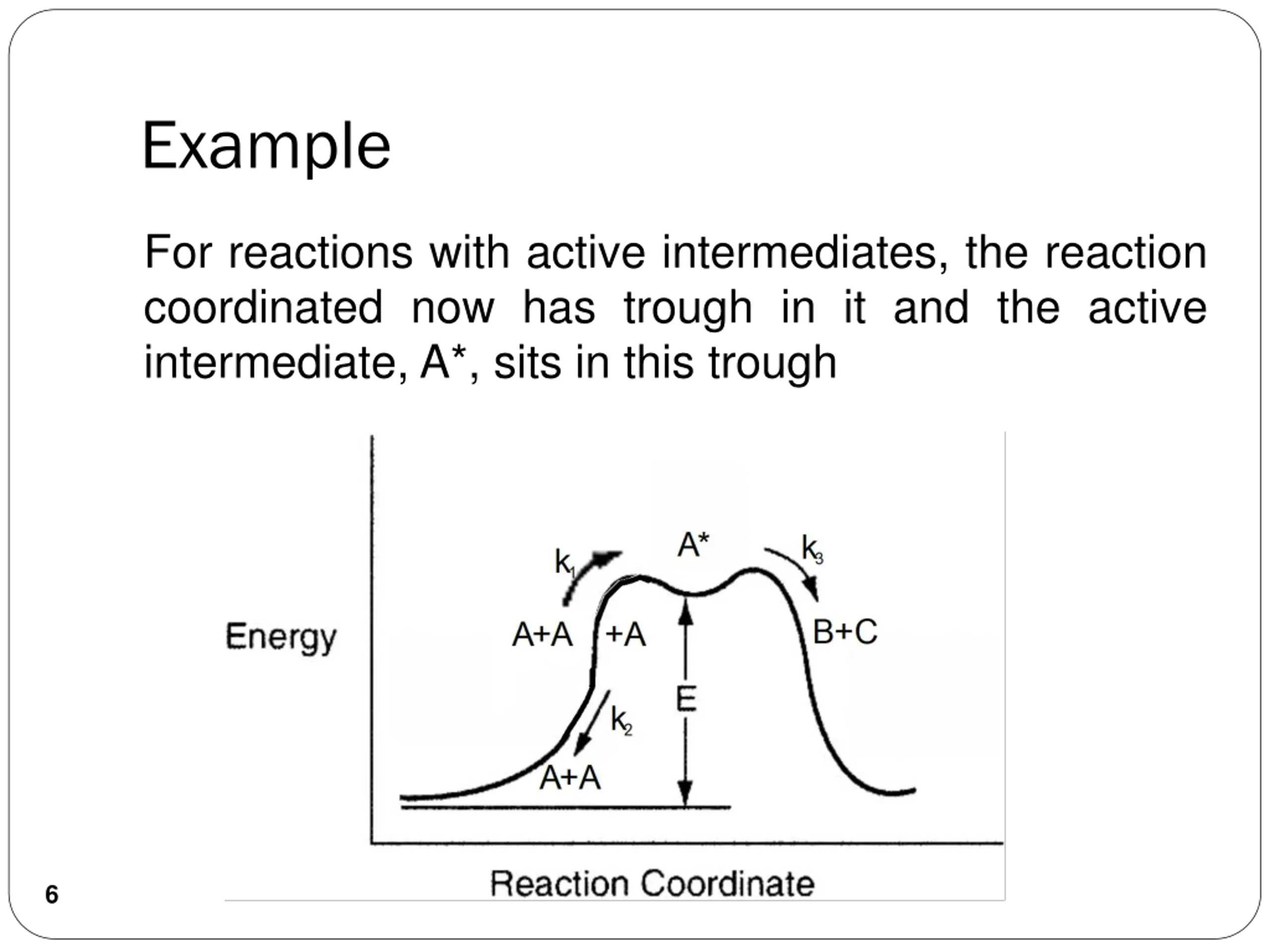 Example For reactions with active intermediates, the reaction coordinated now has trough in it and the active intermediate, A*, sits in this trough 6