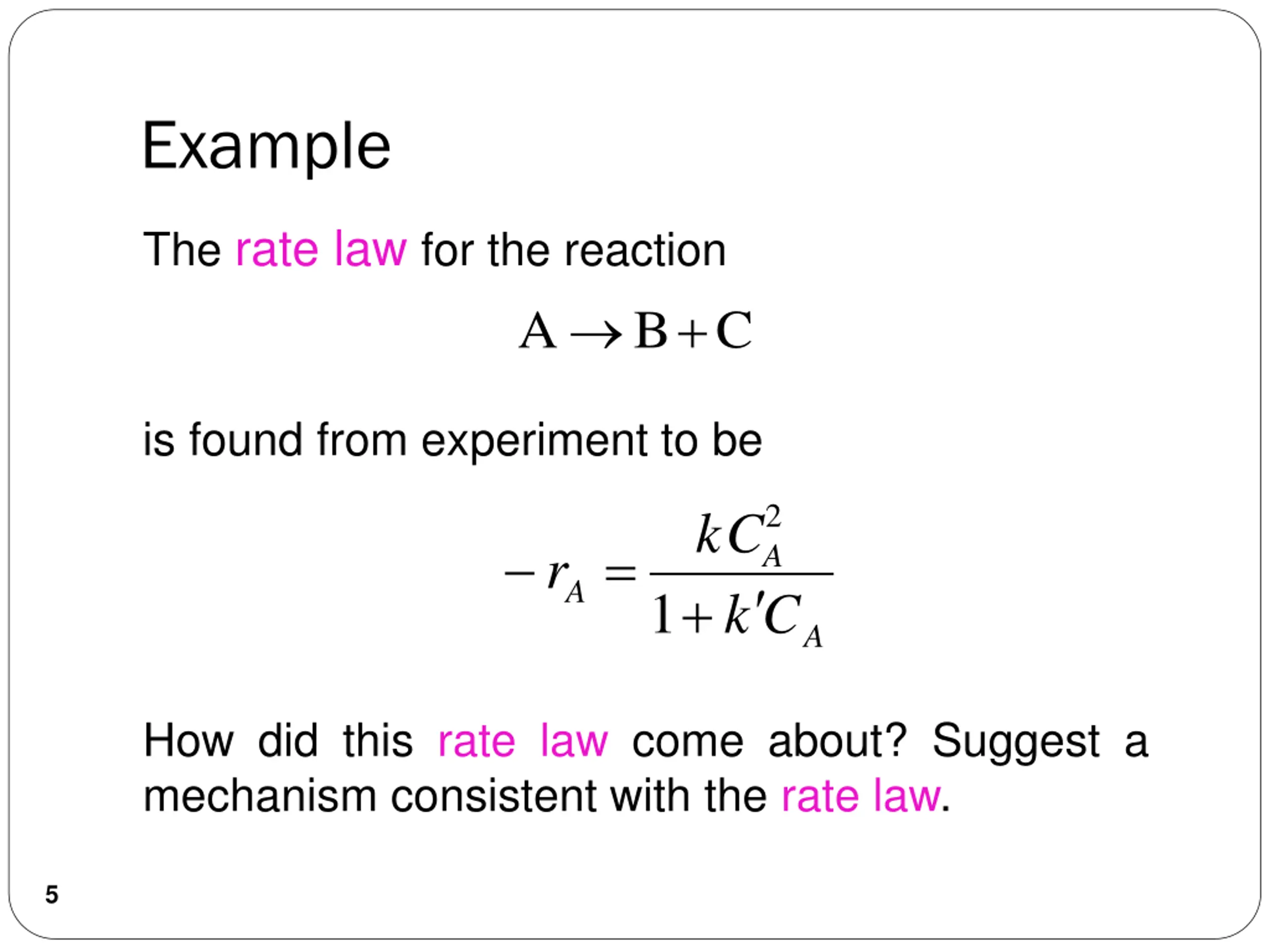 Example The rate law for the reaction + A B C is found from experiment to be 2 kC + = A C r A 1 k A How did this rate law come about? Suggest a mechanism consistent with the rate law. 5