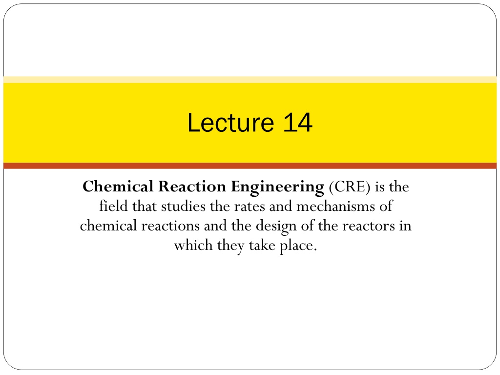 Lecture 14 Chemical Reaction Engineering (CRE) is the field that studies the rates and mechanisms of chemical reactions and the design of the reactors in which they take place.