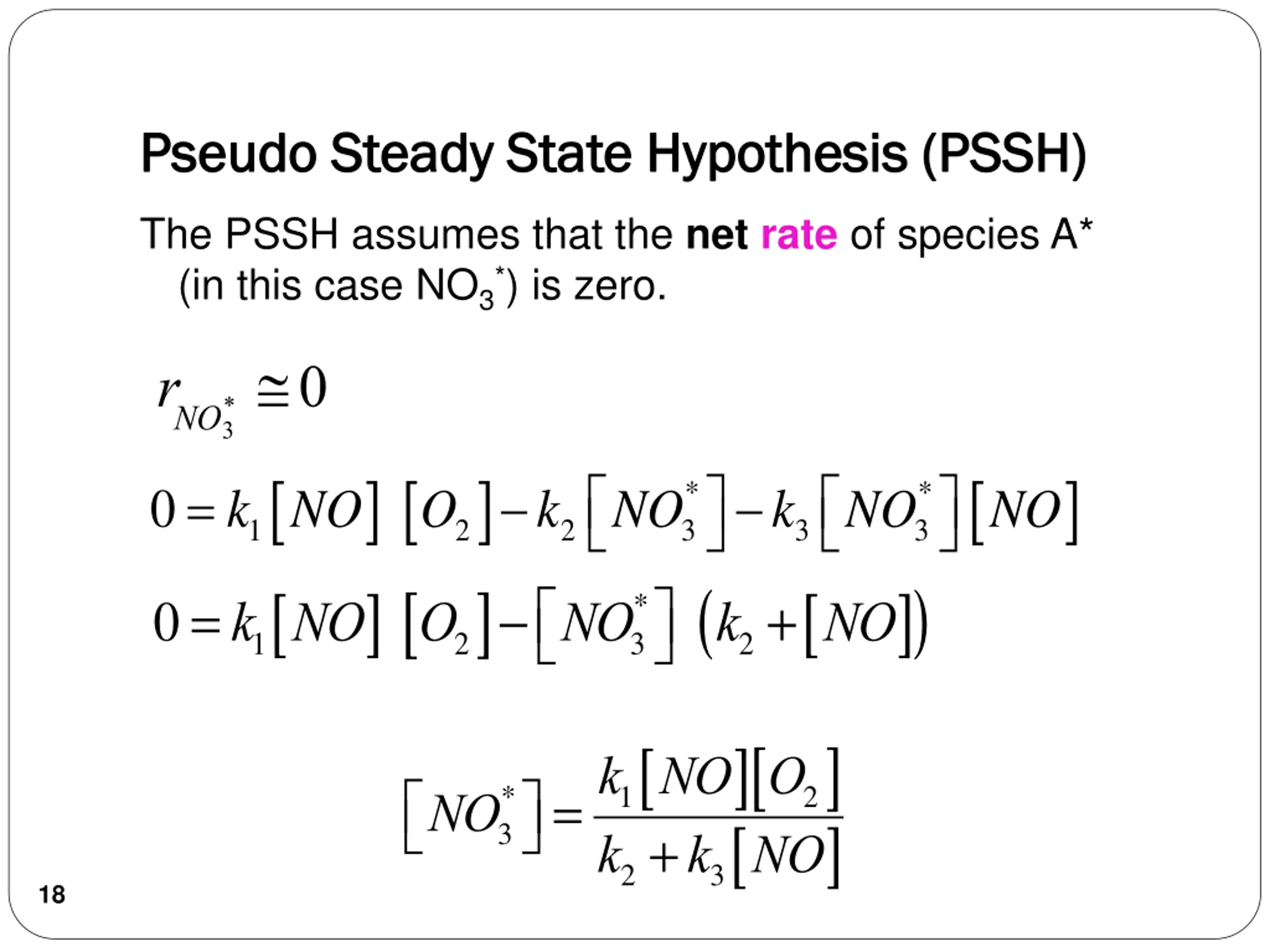 Pseudo Steady State Hypothesis (PSSH) Pseudo Steady State Hypothesis (PSSH) The PSSH assumes that the net rate of species A* (in this case NO3*) is zero. * 0 rNO3 [ ] O2 ]- NO3 ( = * 3 * 3 ) 0 k NO O k NO k NO NO 1 2 2 3 [ [ ] k2+ NO 0 = k1NO * [ ] ] [ ] O2 [ =k1NO k2+k3NO * NO3 18