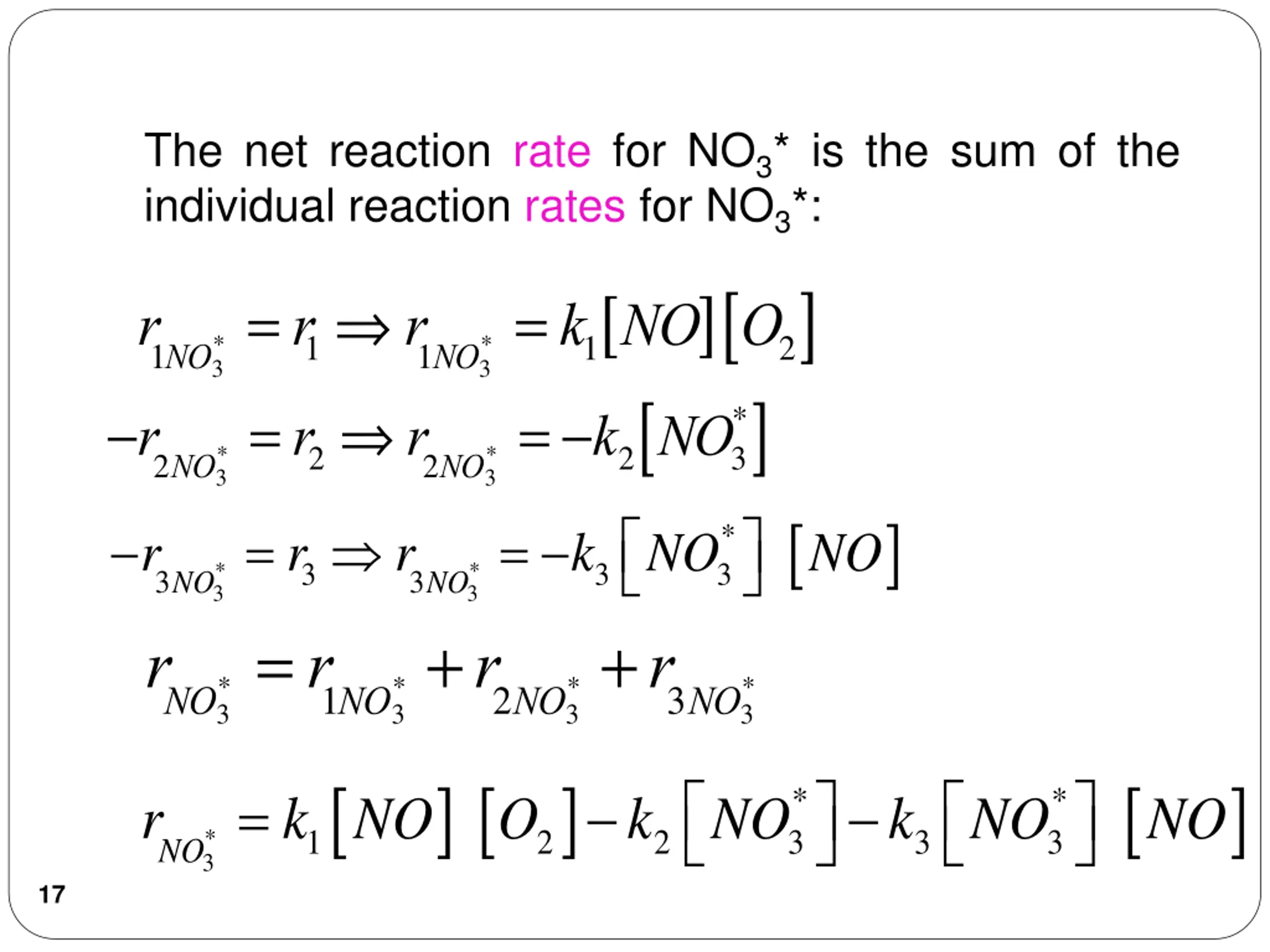 The net reaction rate for NO3* is the sum of the individual reaction rates for NO3*: [ ] ] [ ] O2 * = r1 r1NO3 * = k1NO r1NO3 -r2NO3 [ *= r2 r2NO3 = * = -k2NO3 * = * 3 r r r k NO NO 3 3 * 3 *= r1NO3 * 3 3 3 NO NO *+r2NO3 *+r3NO3 rNO3 * = * 3 * 3 NO r k NO O k NO k NO NO 1 2 2 3 * 3 17