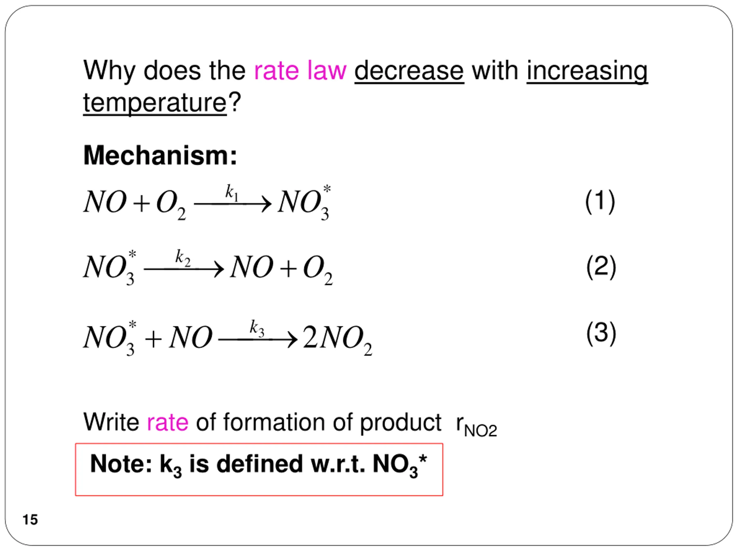 Why does the rate law decrease with increasing temperature? Mechanism: + k * 3 NO O NO (1) 1 2 + k * 3 NO NO O (2) 2 2 + k (3) * 3 2 NO NO NO 3 2 Write rate of formation of product rNO2 Note: k3 is defined w.r.t. NO3* 15