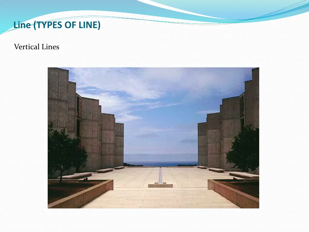 Line (TYPES OF LINE) Vertical Lines Creates the impression of height Creates the feeling of strength and alertness