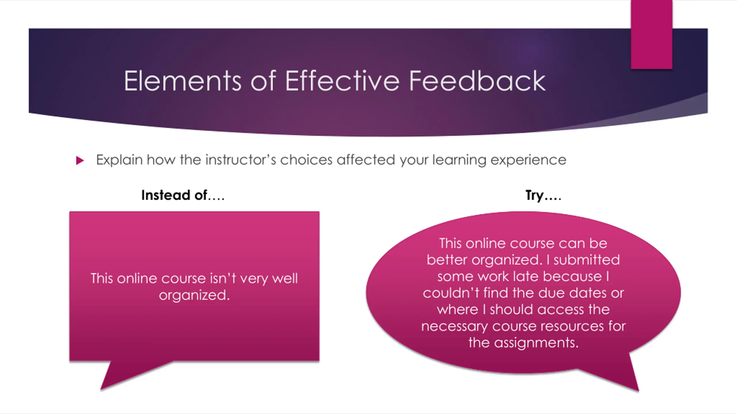 Elements of Effective Feedback Explain how the instructor s choices affected your learning experience Insteadof . Try . This online course can be better organized. I submitted some work late because I couldn t find the due dates or where I should access the necessary course resources for the assignments. This online course isn t very well organized.