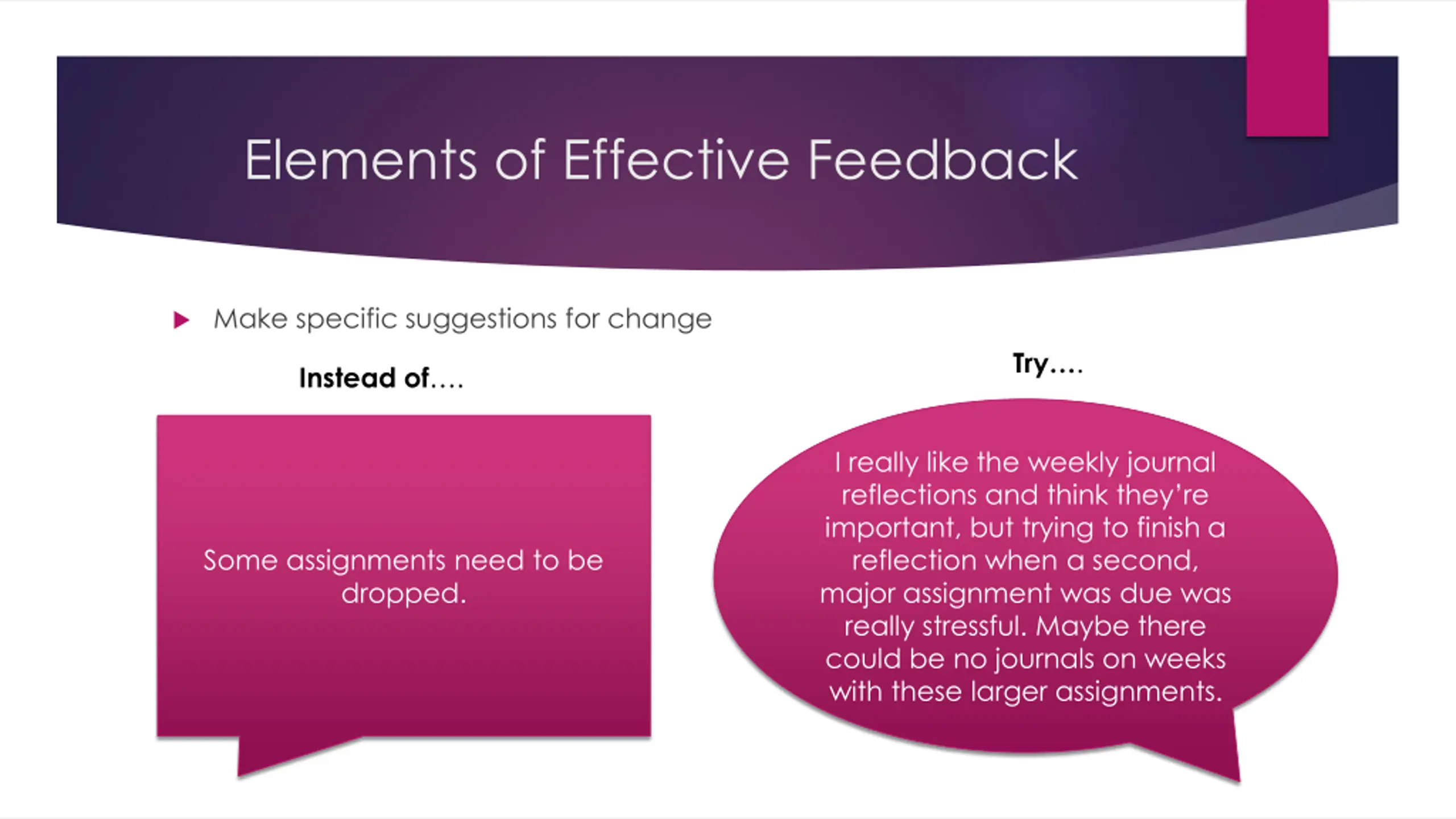Elements of Effective Feedback Make specific suggestions for change Try . Insteadof . I really like the weekly journal reflections and think they re important, but trying to finish a reflection when a second, major assignment was due was really stressful. Maybe there could be no journals on weeks with these larger assignments. Some assignments need to be dropped.
