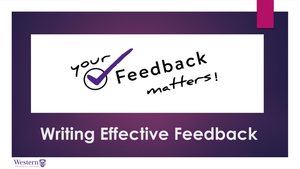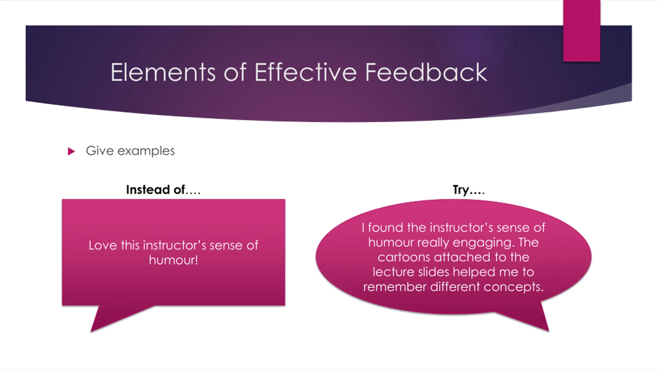 Elements of Effective Feedback Give examples Insteadof . Try . I found the instructor s sense of humour really engaging. The cartoons attached to the lecture slides helped me to remember different concepts. Love this instructor s sense of humour!