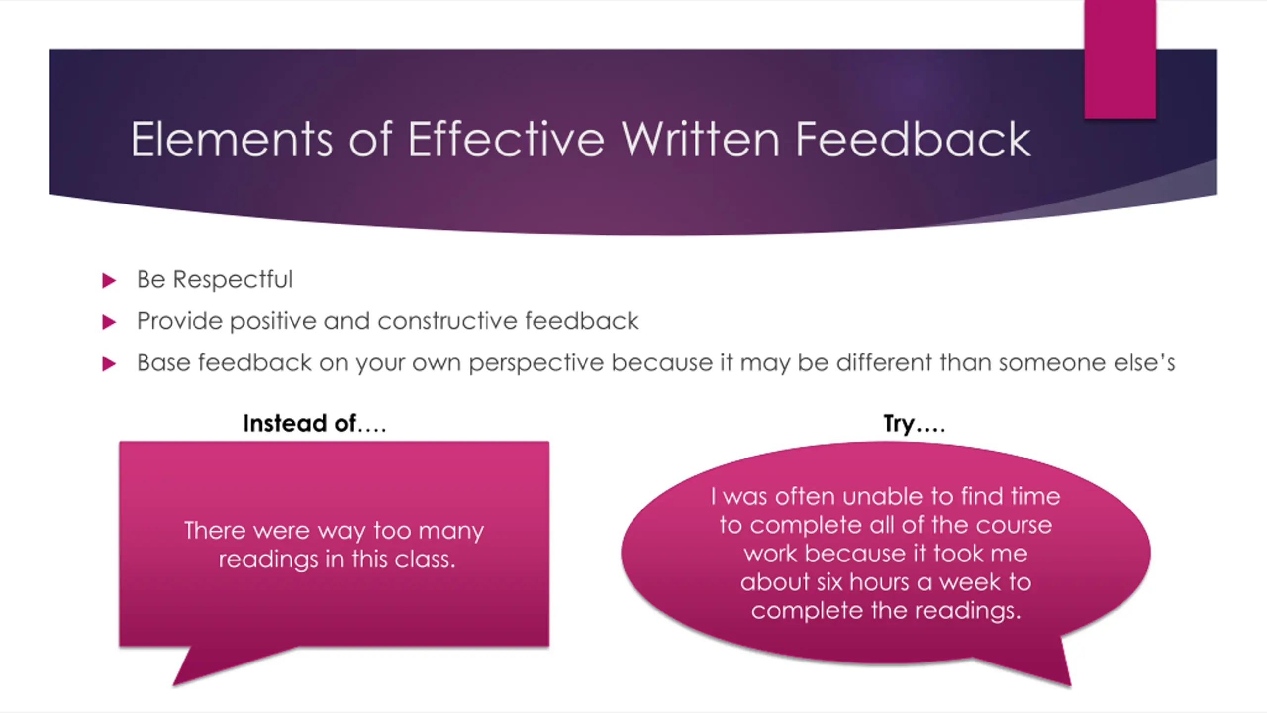 Elements of Effective Written Feedback Be Respectful Provide positive and constructive feedback Base feedback on your own perspective because it may be different than someone else s Insteadof . Try . I was often unable to find time to complete all of the course work because it took me about six hours a week to complete the readings. There were way too many readings in this class.