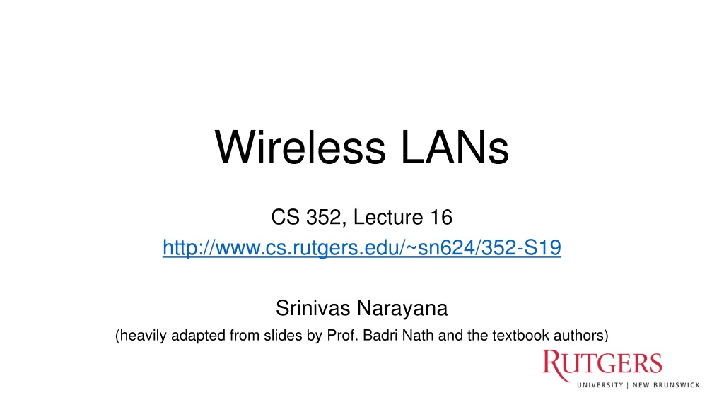 Wireless LANs CS 352, Lecture 16 http://www.cs.rutgers.edu/~sn624/352-S19 Srinivas Narayana (heavily adapted from slides by Prof. Badri Nath and the textbook authors) 1