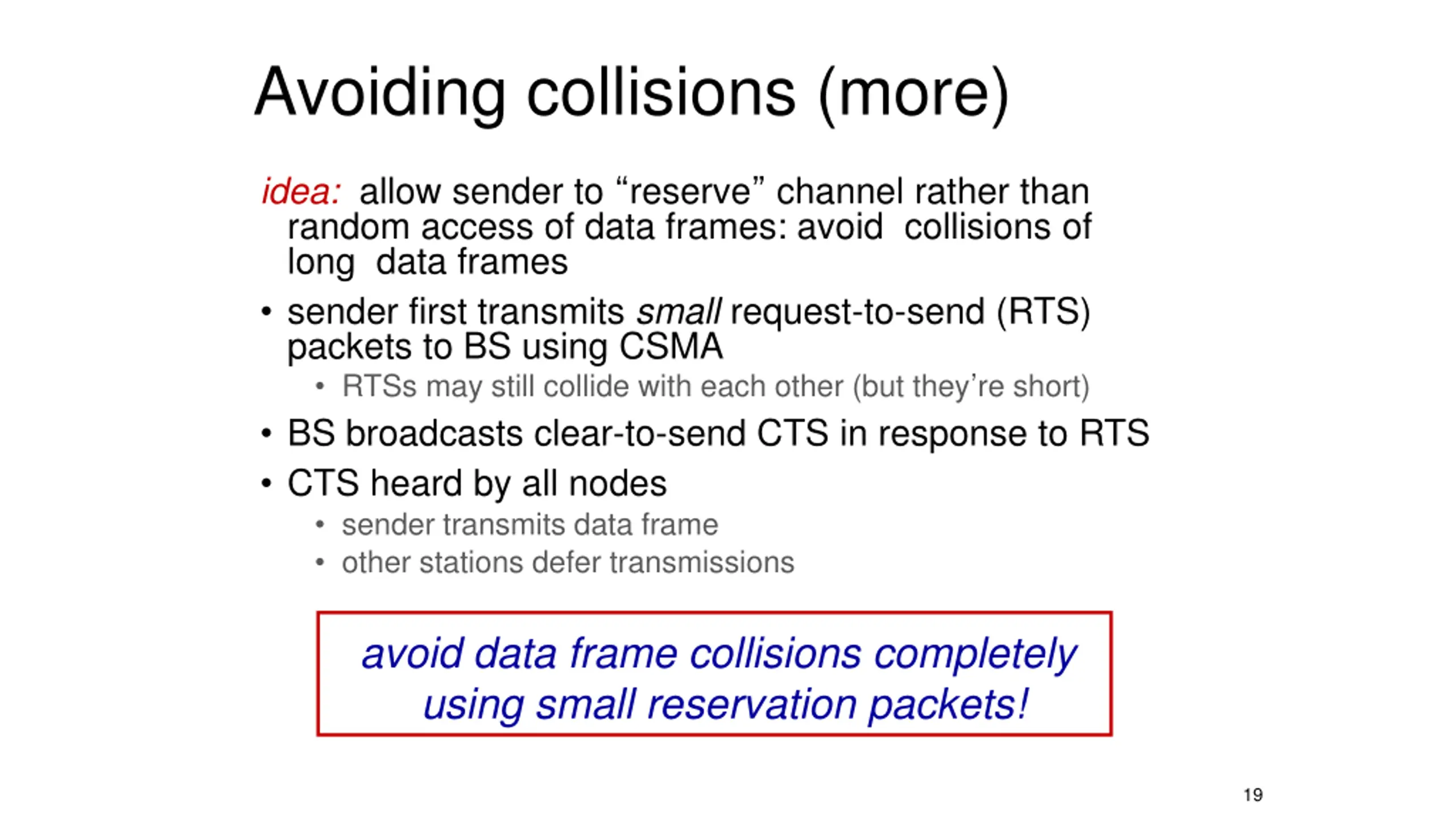 Avoiding collisions (more) idea: allow sender to reserve channel rather than random access of data frames: avoid collisions of long data frames sender first transmits small request-to-send (RTS) packets to BS using CSMA RTSs may still collide with each other (but they re short) BS broadcasts clear-to-send CTS in response to RTS CTS heard by all nodes sender transmits data frame other stations defer transmissions avoid data frame collisions completely using small reservation packets! 19