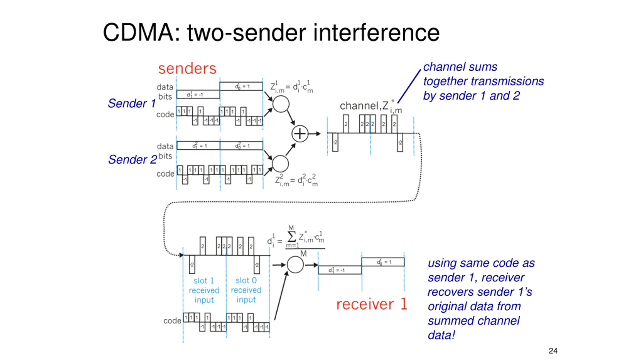 CDMA: two-sender interference channel sums together transmissions by sender 1 and 2 Sender 1 Sender 2 using same code as sender 1, receiver recovers sender 1 s original data from summed channel data! 24