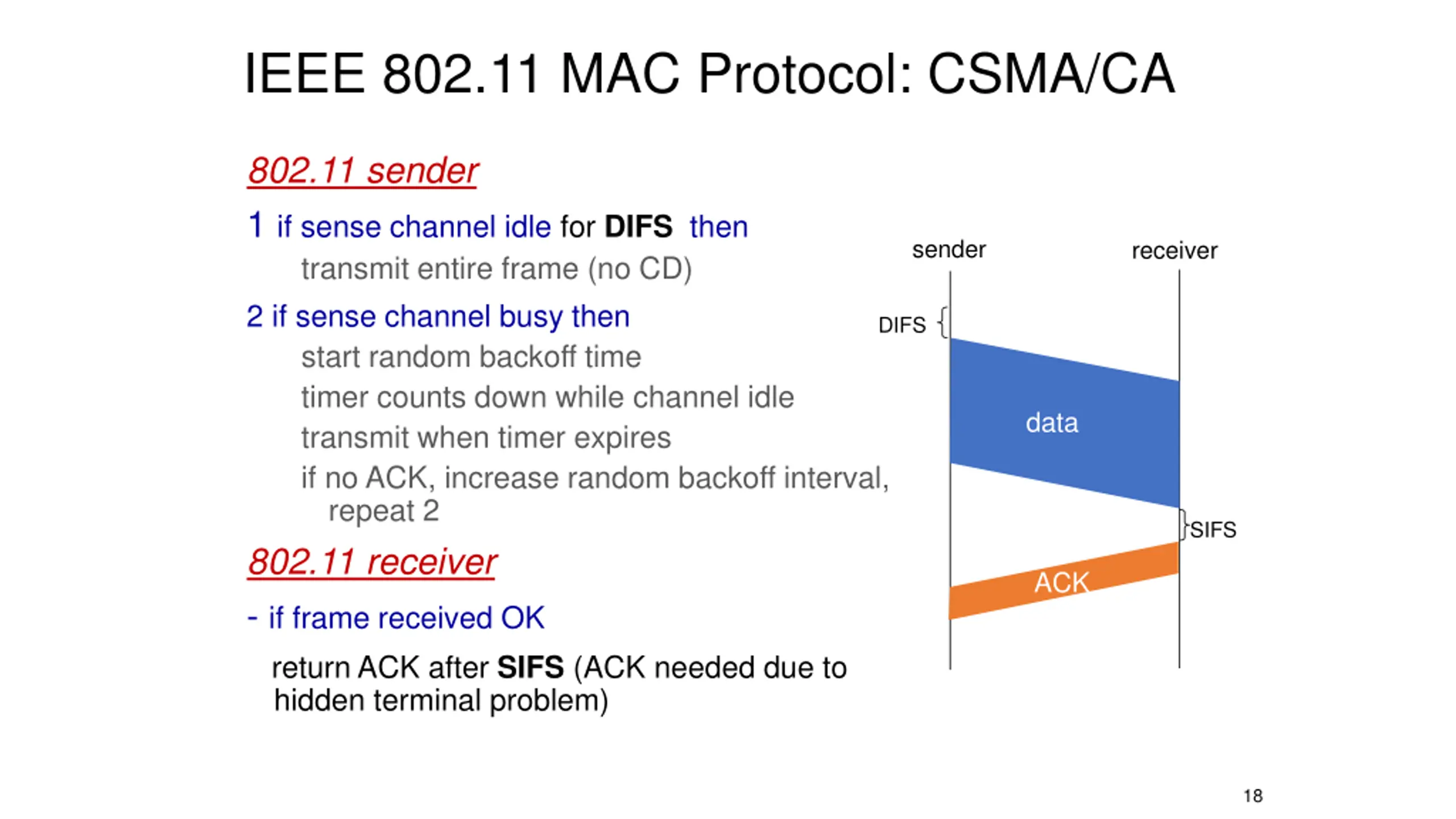 IEEE 802.11 MAC Protocol: CSMA/CA 802.11 sender 1 if sense channel idle for DIFS then transmit entire frame (no CD) 2 if sense channel busy then start random backoff time timer counts down while channel idle transmit when timer expires if no ACK, increase random backoff interval, repeat 2 802.11 receiver - if frame received OK return ACK after SIFS (ACK needed due to hidden terminal problem) sender receiver DIFS data SIFS ACK 18