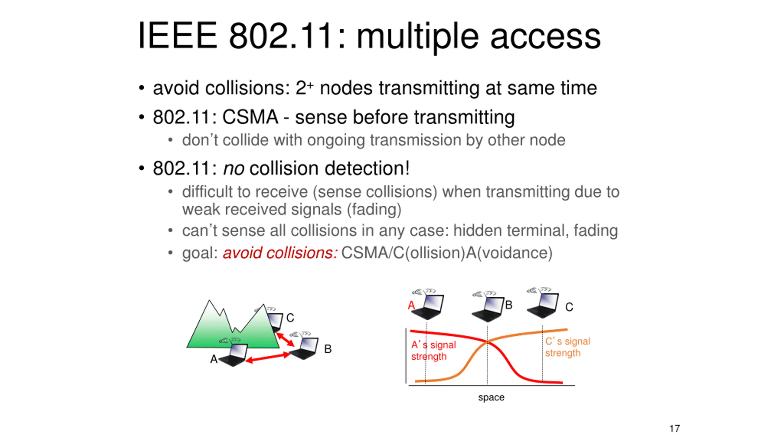 IEEE 802.11: multiple access avoid collisions: 2+ nodes transmitting at same time 802.11: CSMA - sense before transmitting don t collide with ongoing transmission by other node 802.11: no collision detection! difficult to receive (sense collisions) when transmitting due to weak received signals (fading) can t sense all collisions in any case: hidden terminal, fading goal: avoid collisions: CSMA/C(ollision)A(voidance) B A C C C s signal strength A s signal strength B A space 17