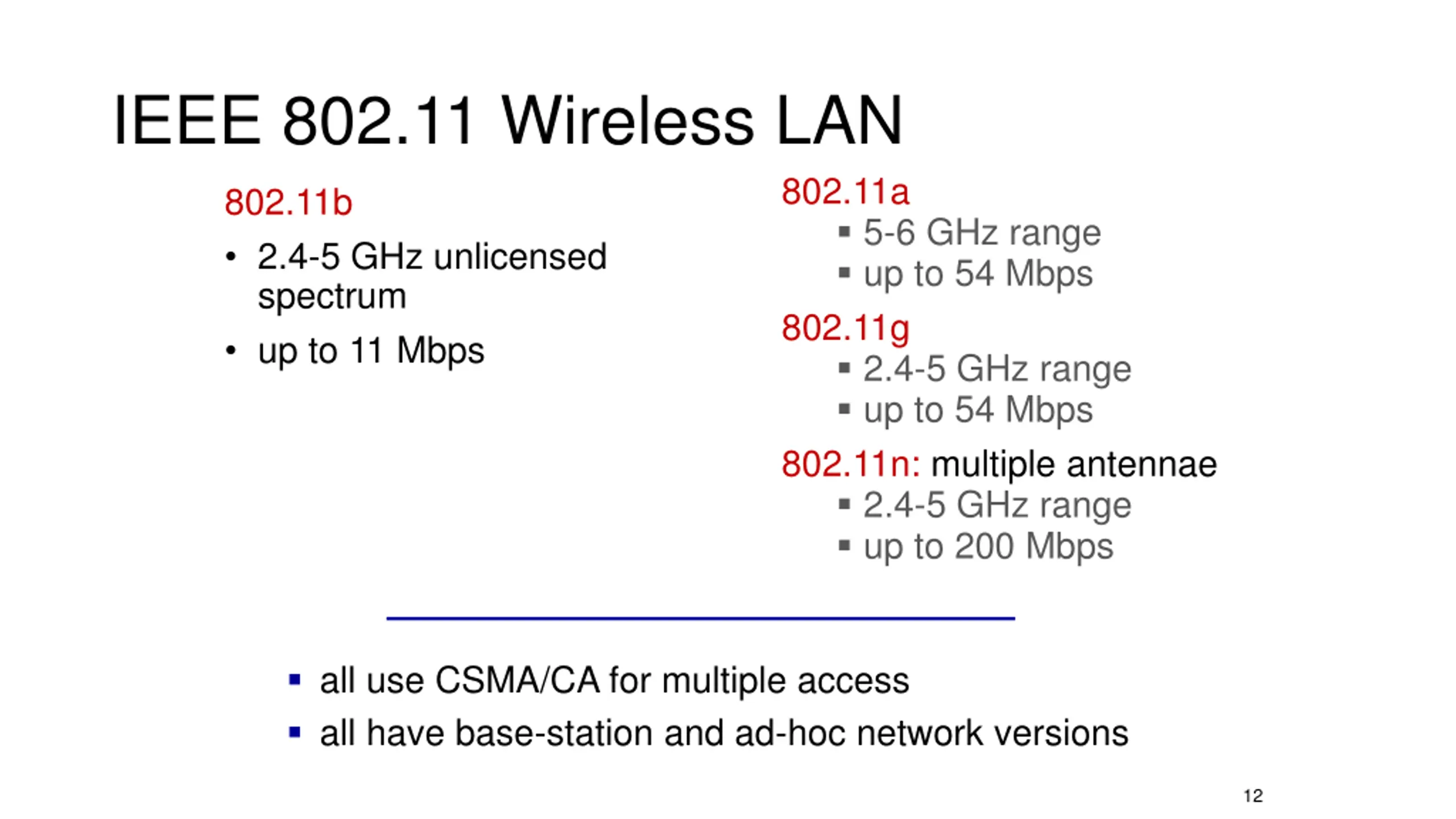 IEEE 802.11 Wireless LAN 802.11a 5-6 GHz range up to 54 Mbps 802.11g 2.4-5 GHz range up to 54 Mbps 802.11n: multiple antennae 2.4-5 GHz range up to 200 Mbps 802.11b 2.4-5 GHz unlicensed spectrum up to 11 Mbps all use CSMA/CA for multiple access all have base-station and ad-hoc network versions 12