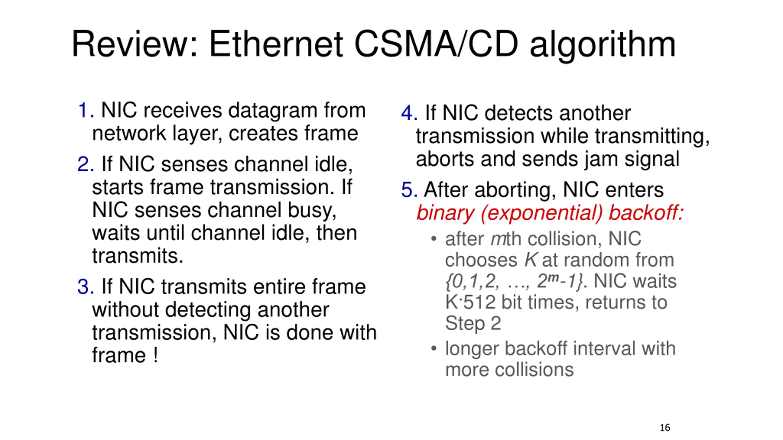 Review: Ethernet CSMA/CD algorithm 1. NIC receives datagram from network layer, creates frame 2. If NIC senses channel idle, starts frame transmission. If NIC senses channel busy, waits until channel idle, then transmits. 3. If NIC transmits entire frame without detecting another transmission, NIC is done with frame ! 4. If NIC detects another transmission while transmitting, aborts and sends jam signal 5. After aborting, NIC enters binary (exponential) backoff: after mth collision, NIC chooses K at random from {0,1,2, , 2m-1}. NIC waits K 512 bit times, returns to Step 2 longer backoff interval with more collisions 16