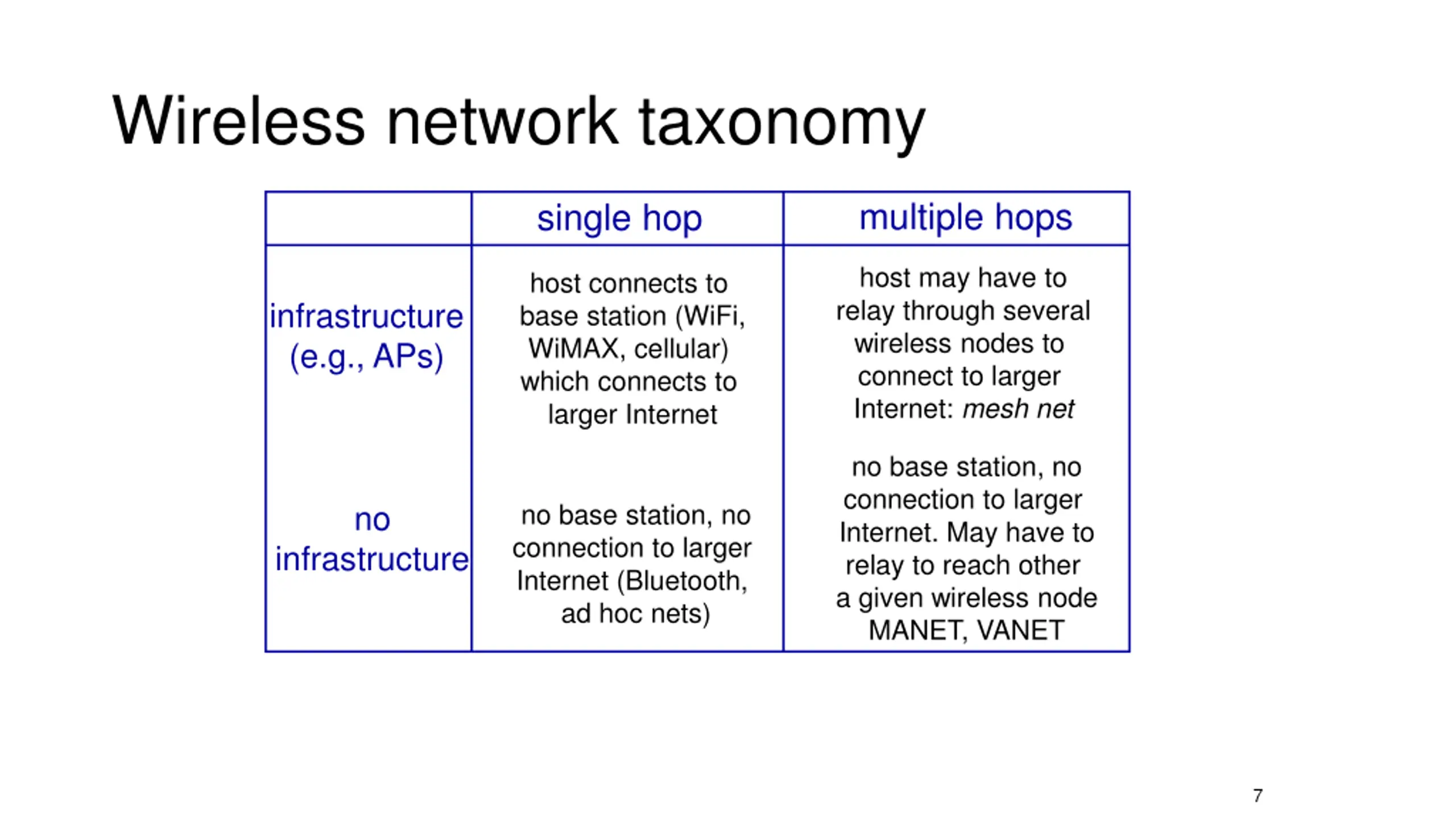 Wireless network taxonomy multiple hops single hop host may have to relay through several wireless nodes to connect to larger Internet: mesh net host connects to base station (WiFi, WiMAX, cellular) which connects to larger Internet infrastructure (e.g., APs) no base station, no connection to larger Internet. May have to relay to reach other a given wireless node MANET, VANET no base station, no connection to larger Internet (Bluetooth, ad hoc nets) no infrastructure 7