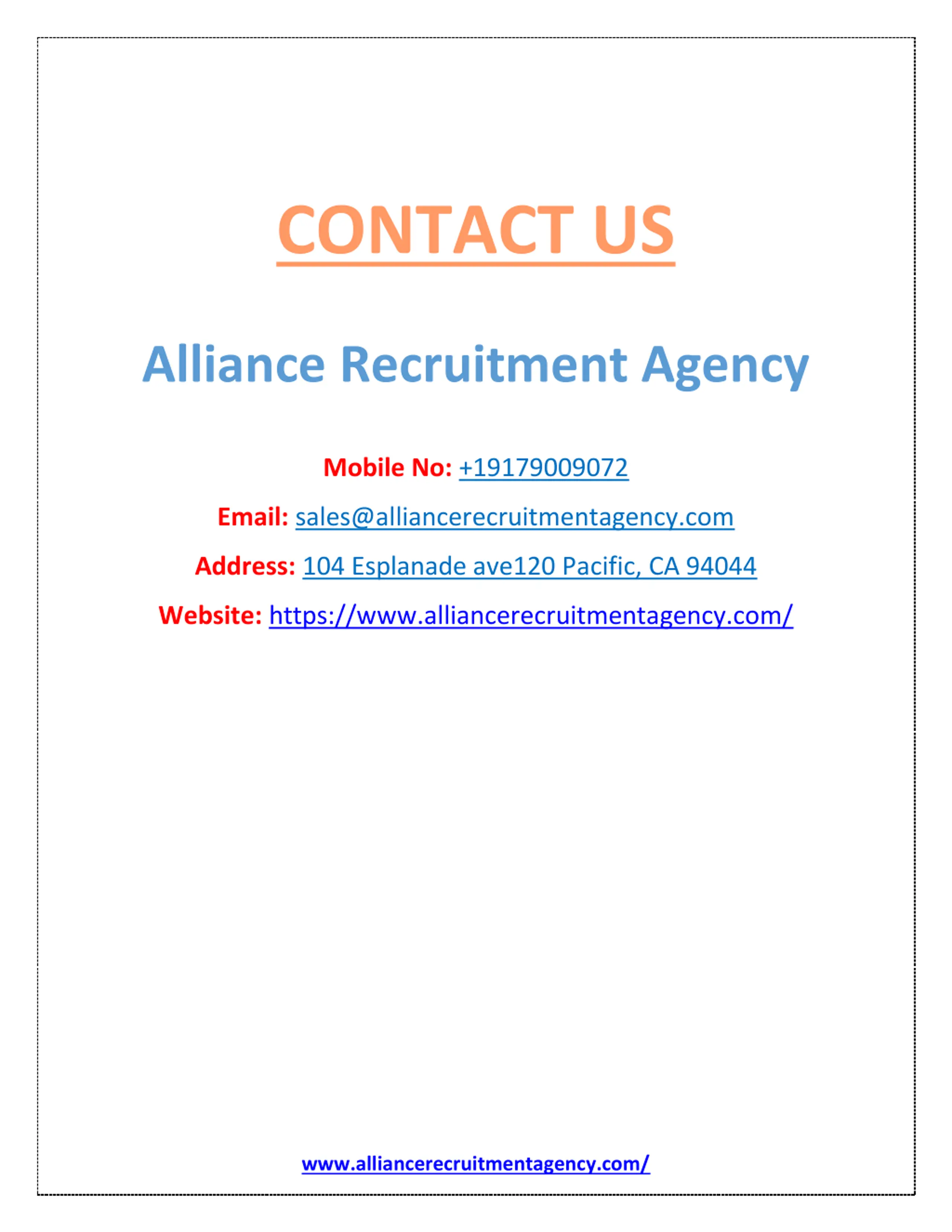 CONTACT US Alliance Recruitment Agency Mobile No: +19179009072 Email: sales@alliancerecruitmentagency.com Address: 104 Esplanade ave120 Pacific, CA 94044 Website: https://www.alliancerecruitmentagency.com/ www.alliancerecruitmentagency.com/
