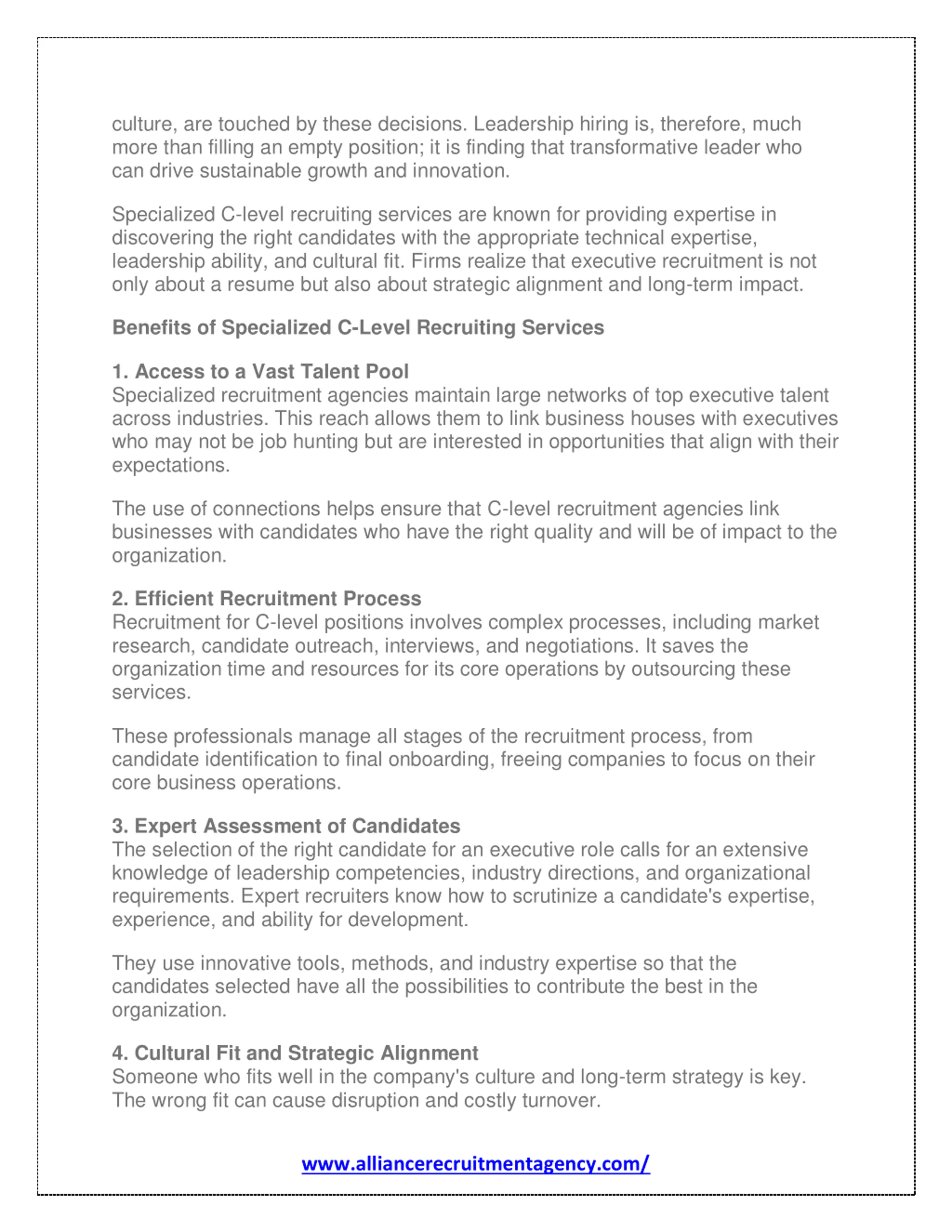 culture, are touched by these decisions. Leadership hiring is, therefore, much more than filling an empty position; it is finding that transformative leader who can drive sustainable growth and innovation. Specialized C-level recruiting services are known for providing expertise in discovering the right candidates with the appropriate technical expertise, leadership ability, and cultural fit. Firms realize that executive recruitment is not only about a resume but also about strategic alignment and long-term impact. Benefits of Specialized C-Level Recruiting Services 1. Access to a Vast Talent Pool Specialized recruitment agencies maintain large networks of top executive talent across industries. This reach allows them to link business houses with executives who may not be job hunting but are interested in opportunities that align with their expectations. The use of connections helps ensure that C-level recruitment agencies link businesses with candidates who have the right quality and will be of impact to the organization. 2. Efficient Recruitment Process Recruitment for C-level positions involves complex processes, including market research, candidate outreach, interviews, and negotiations. It saves the organization time and resources for its core operations by outsourcing these services. These professionals manage all stages of the recruitment process, from candidate identification to final onboarding, freeing companies to focus on their core business operations. 3. Expert Assessment of Candidates The selection of the right candidate for an executive role calls for an extensive knowledge of leadership competencies, industry directions, and organizational requirements. Expert recruiters know how to scrutinize a candidate's expertise, experience, and ability for development. They use innovative tools, methods, and industry expertise so that the candidates selected have all the possibilities to contribute the best in the organization. 4. Cultural Fit and Strategic Alignment Someone who fits well in the company's culture and long-term strategy is key. The wrong fit can cause disruption and costly turnover. www.alliancerecruitmentagency.com/