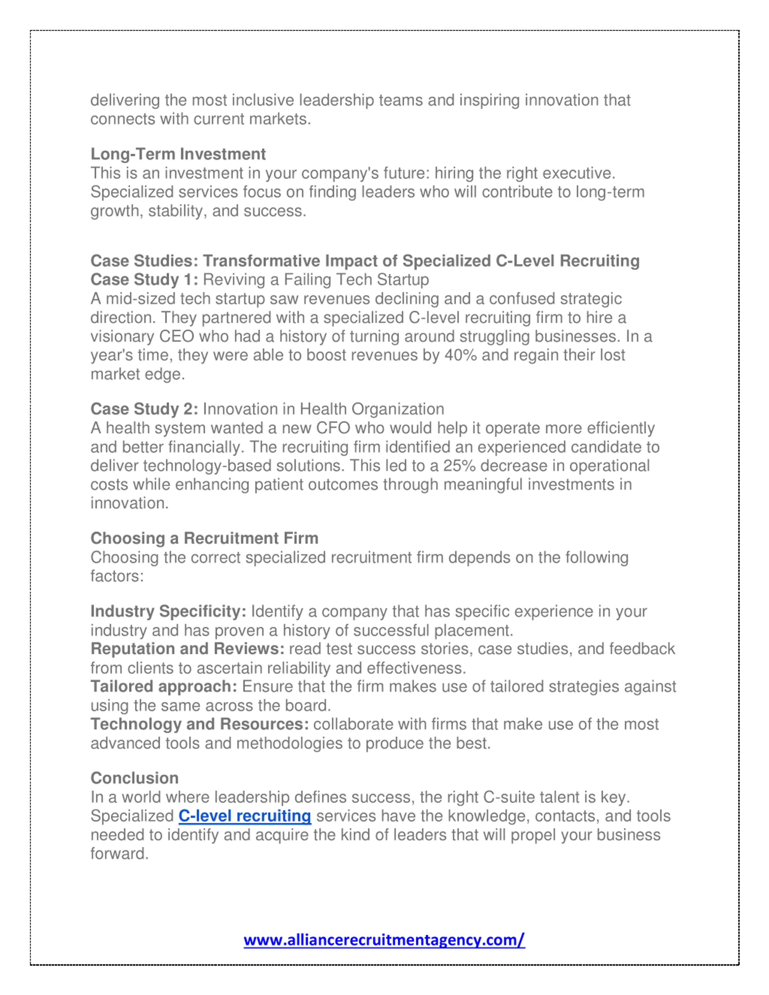 delivering the most inclusive leadership teams and inspiring innovation that connects with current markets. Long-Term Investment This is an investment in your company's future: hiring the right executive. Specialized services focus on finding leaders who will contribute to long-term growth, stability, and success. Case Studies: Transformative Impact of Specialized C-Level Recruiting Case Study 1: Reviving a Failing Tech Startup A mid-sized tech startup saw revenues declining and a confused strategic direction. They partnered with a specialized C-level recruiting firm to hire a visionary CEO who had a history of turning around struggling businesses. In a year's time, they were able to boost revenues by 40% and regain their lost market edge. Case Study 2: Innovation in Health Organization A health system wanted a new CFO who would help it operate more efficiently and better financially. The recruiting firm identified an experienced candidate to deliver technology-based solutions. This led to a 25% decrease in operational costs while enhancing patient outcomes through meaningful investments in innovation. Choosing a Recruitment Firm Choosing the correct specialized recruitment firm depends on the following factors: Industry Specificity: Identify a company that has specific experience in your industry and has proven a history of successful placement. Reputation and Reviews: read test success stories, case studies, and feedback from clients to ascertain reliability and effectiveness. Tailored approach: Ensure that the firm makes use of tailored strategies against using the same across the board. Technology and Resources: collaborate with firms that make use of the most advanced tools and methodologies to produce the best. Conclusion In a world where leadership defines success, the right C-suite talent is key. Specialized C-level recruiting services have the knowledge, contacts, and tools needed to identify and acquire the kind of leaders that will propel your business forward. www.alliancerecruitmentagency.com/