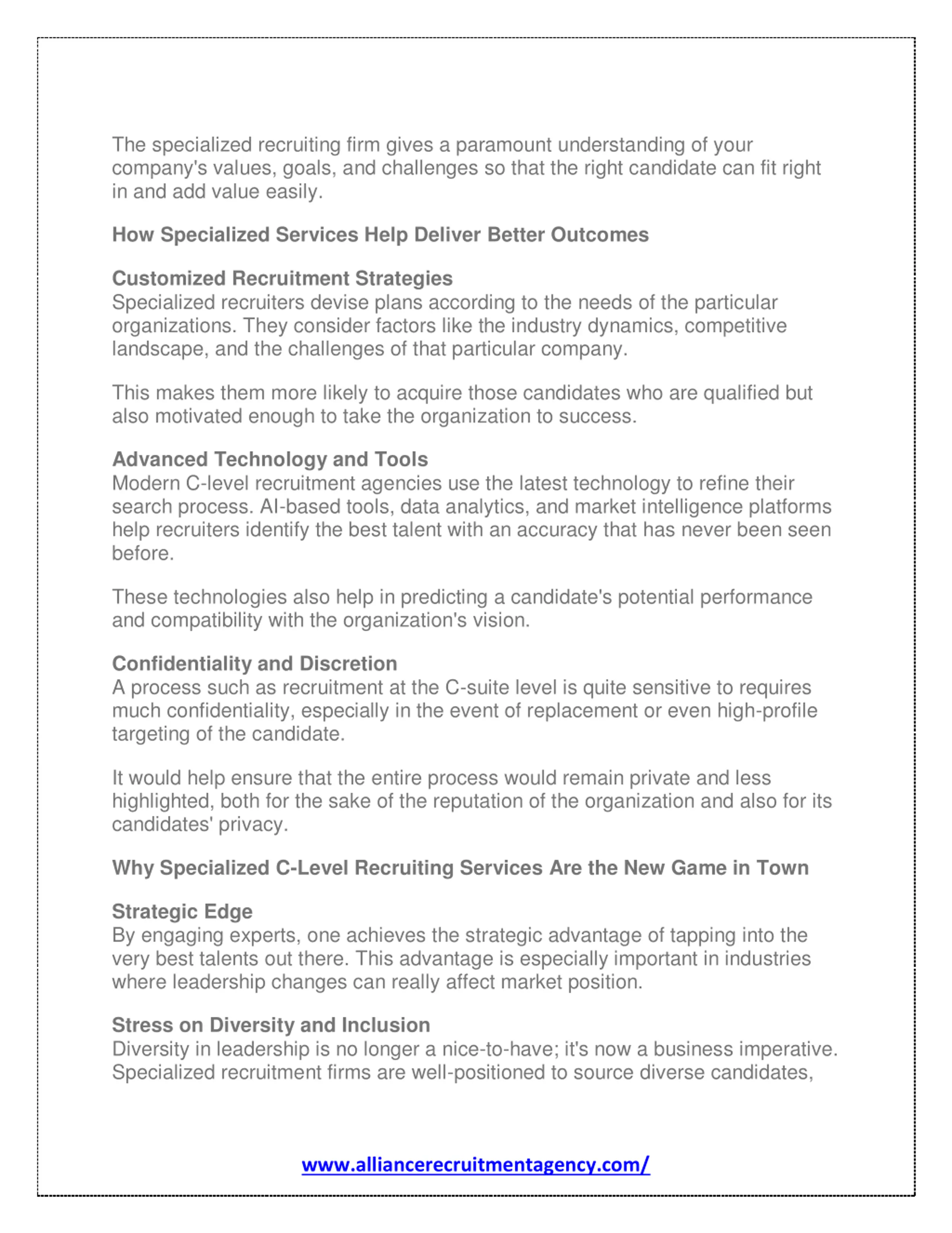 The specialized recruiting firm gives a paramount understanding of your company's values, goals, and challenges so that the right candidate can fit right in and add value easily. How Specialized Services Help Deliver Better Outcomes Customized Recruitment Strategies Specialized recruiters devise plans according to the needs of the particular organizations. They consider factors like the industry dynamics, competitive landscape, and the challenges of that particular company. This makes them more likely to acquire those candidates who are qualified but also motivated enough to take the organization to success. Advanced Technology and Tools Modern C-level recruitment agencies use the latest technology to refine their search process. AI-based tools, data analytics, and market intelligence platforms help recruiters identify the best talent with an accuracy that has never been seen before. These technologies also help in predicting a candidate's potential performance and compatibility with the organization's vision. Confidentiality and Discretion A process such as recruitment at the C-suite level is quite sensitive to requires much confidentiality, especially in the event of replacement or even high-profile targeting of the candidate. It would help ensure that the entire process would remain private and less highlighted, both for the sake of the reputation of the organization and also for its candidates' privacy. Why Specialized C-Level Recruiting Services Are the New Game in Town Strategic Edge By engaging experts, one achieves the strategic advantage of tapping into the very best talents out there. This advantage is especially important in industries where leadership changes can really affect market position. Stress on Diversity and Inclusion Diversity in leadership is no longer a nice-to-have; it's now a business imperative. Specialized recruitment firms are well-positioned to source diverse candidates, www.alliancerecruitmentagency.com/