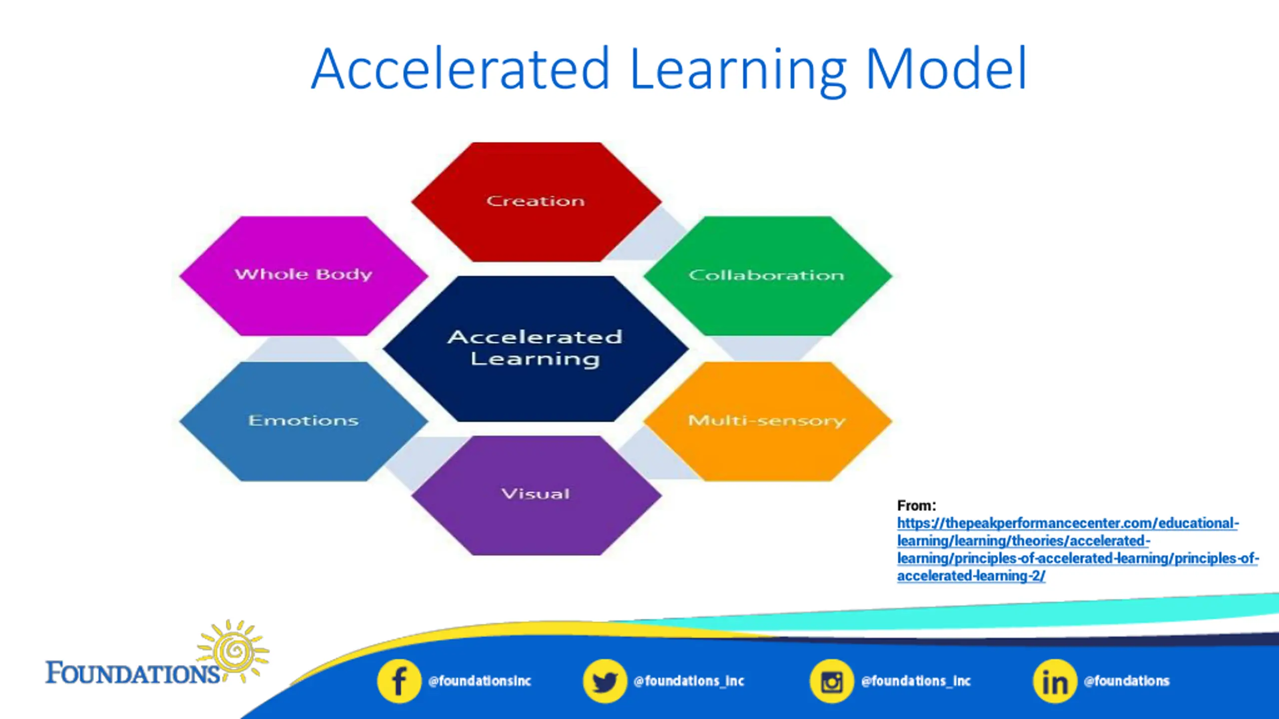 Accelerated Learning Engages both the mind and body Involves students in content development Fosters a collaborative environment Employs multiple teaching strategies & methods Embraces differences in learning styles Includes hands-on opportunities & experiences Incorporates fun activities