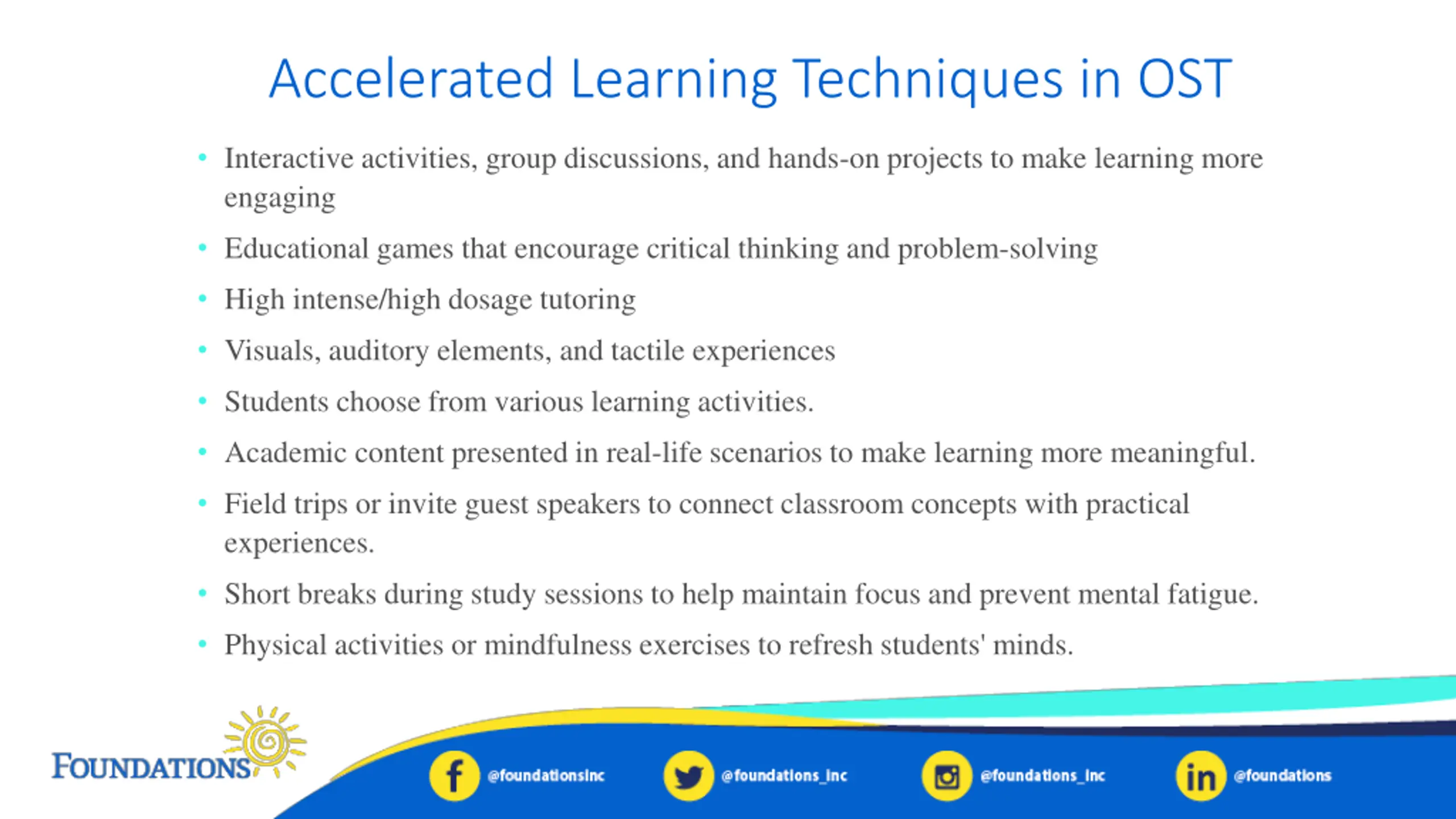 Accelerated Learning Techniques in OST Interactive activities, group discussions, and hands-on projects to make learning more engaging Educational games that encourage critical thinking and problem-solving High intense/high dosage tutoring Visuals, auditory elements, and tactile experiences Students choose from various learning activities. Academic content presented in real-life scenarios to make learning more meaningful. Field trips or invite guest speakers to connect classroom concepts with practical experiences. Short breaks during study sessions to help maintain focus and prevent mental fatigue. Physical activities or mindfulness exercises to refresh students' minds.
