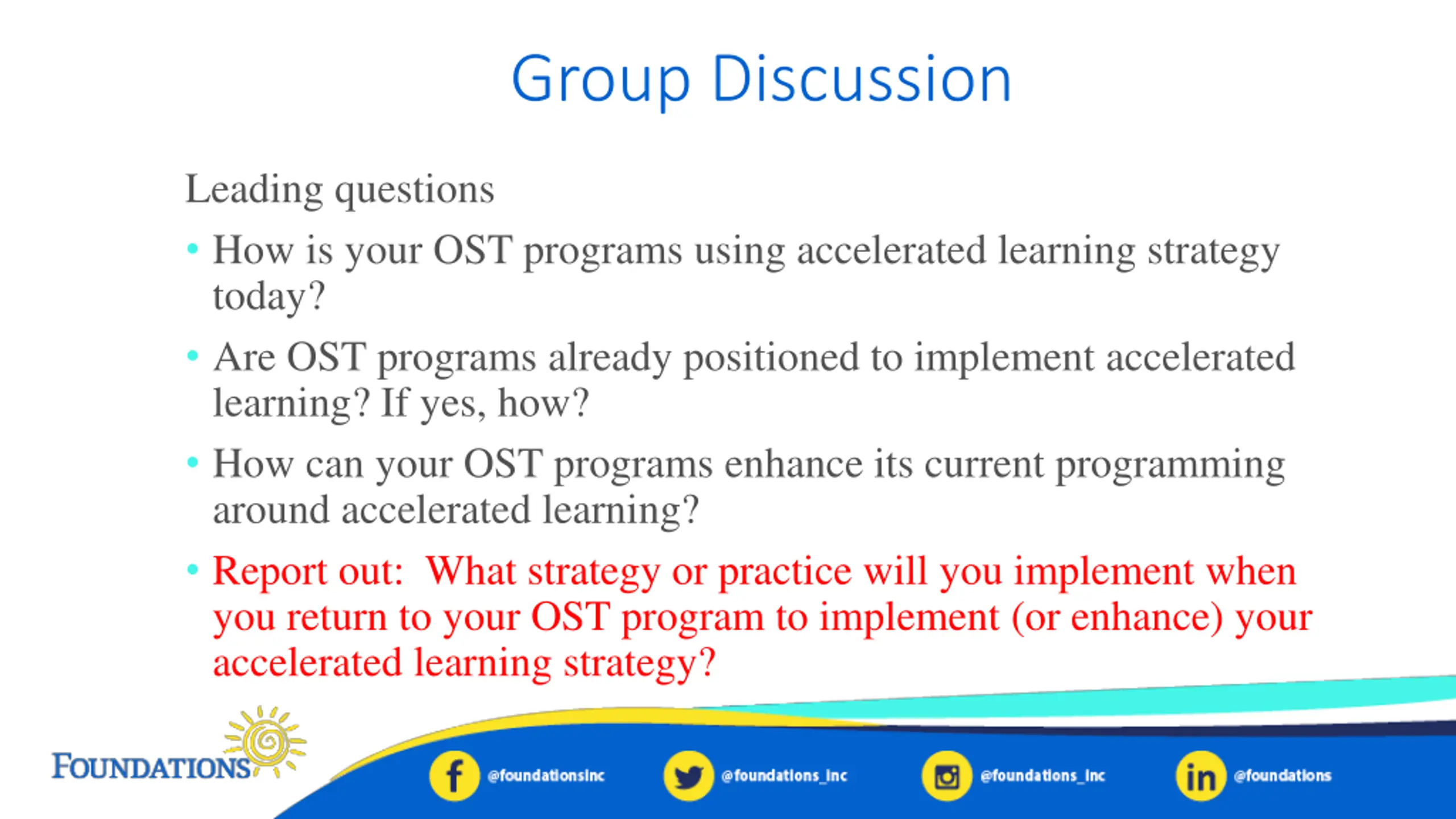 Group Discussion Leading questions How is your OST programs using accelerated learning strategy today? Are OST programs already positioned to implement accelerated learning? If yes, how? How can your OST programs enhance its current programming around accelerated learning? Report out: What strategy or practice will you implement when you return to your OST program to implement (or enhance) your accelerated learning strategy?