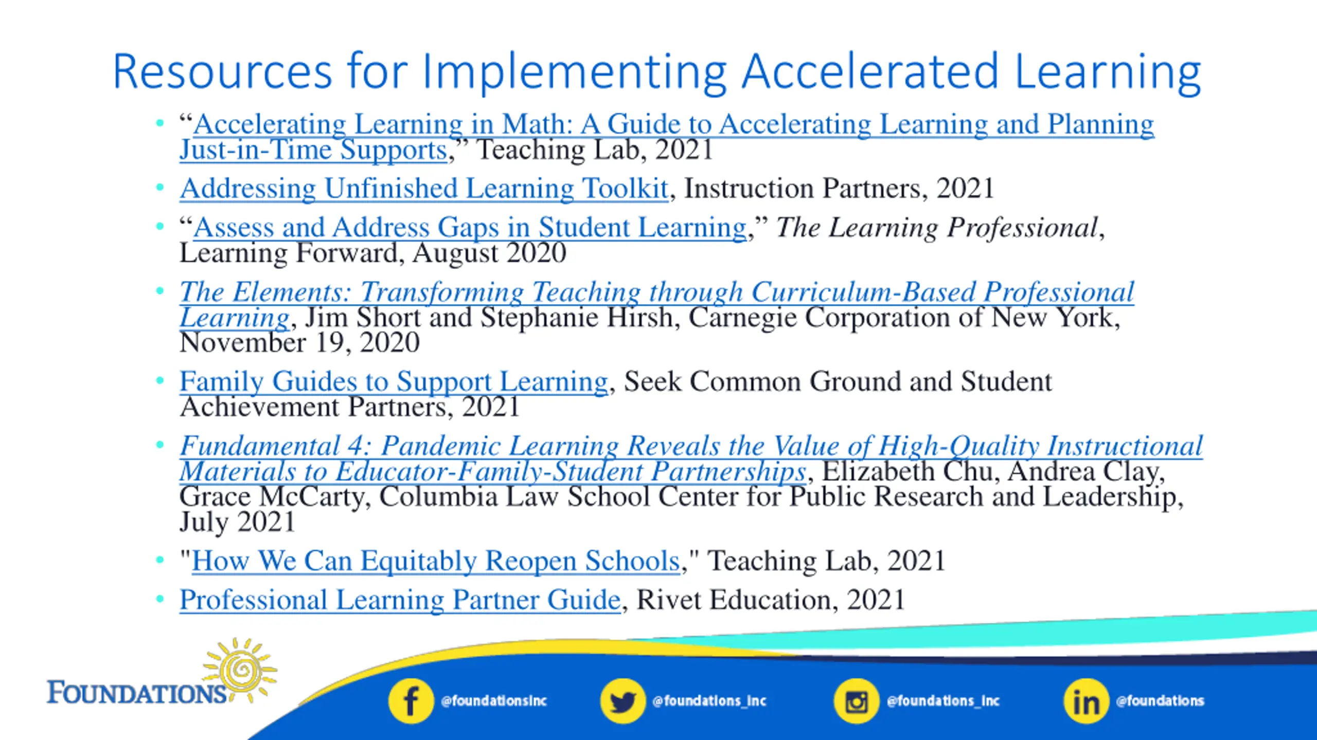 Resources for Implementing Accelerated Learning Accelerating Learning in Math: A Guide to Accelerating Learning and Planning Just-in-Time Supports, Teaching Lab, 2021 Addressing Unfinished Learning Toolkit, Instruction Partners, 2021 Assess and Address Gaps in Student Learning, The Learning Professional, Learning Forward, August 2020 The Elements: Transforming Teaching through Curriculum-Based Professional Learning, Jim Short and Stephanie Hirsh, Carnegie Corporation of New York, November 19, 2020 Family Guides to Support Learning, Seek Common Ground and Student Achievement Partners, 2021 Fundamental 4: Pandemic Learning Reveals the Value of High-Quality Instructional Materials to Educator-Family-Student Partnerships, Elizabeth Chu, Andrea Clay, Grace McCarty, Columbia Law School Center for Public Research and Leadership, July 2021 "How We Can Equitably Reopen Schools," Teaching Lab, 2021 Professional Learning Partner Guide, Rivet Education, 2021