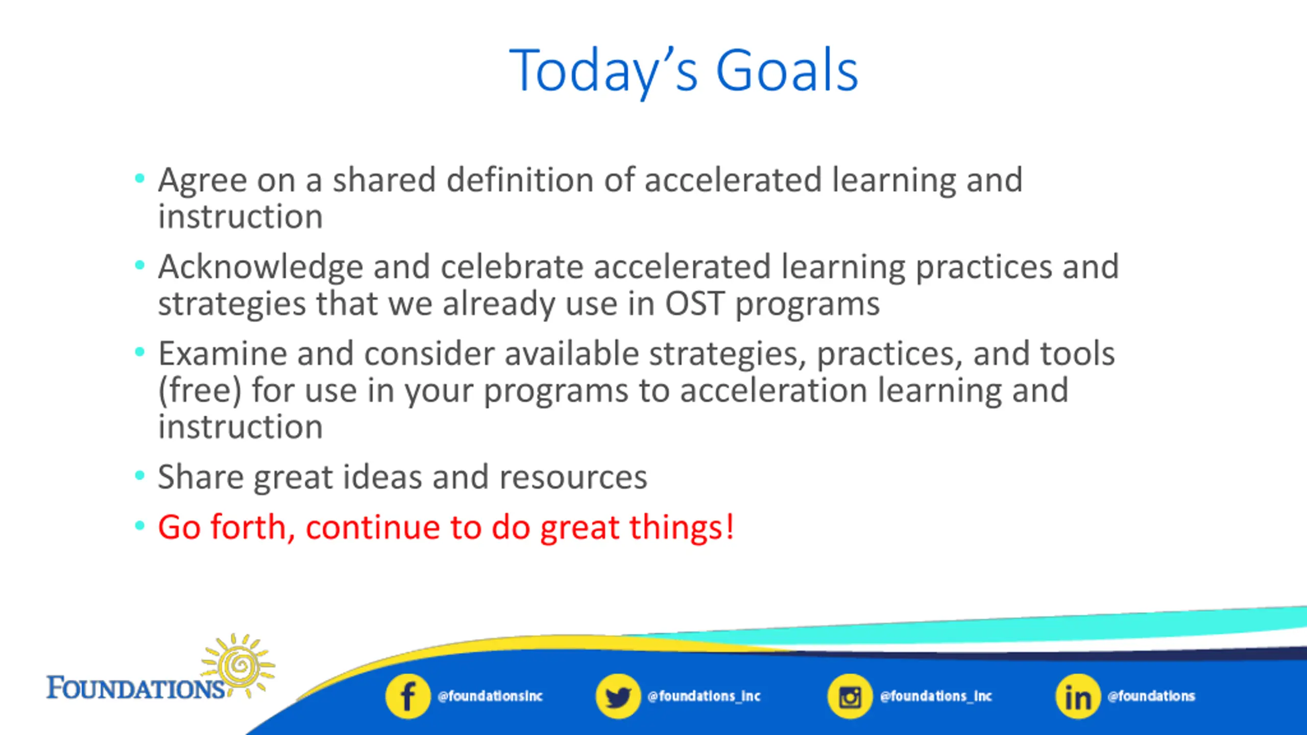 Todays Goals Agree on a shared definition of accelerated learning and instruction Acknowledge and celebrate accelerated learning practices and strategies that we already use in OST programs Examine and consider available strategies, practices, and tools (free) for use in your programs to acceleration learning and instruction Share great ideas and resources Go forth, continue to do great things!